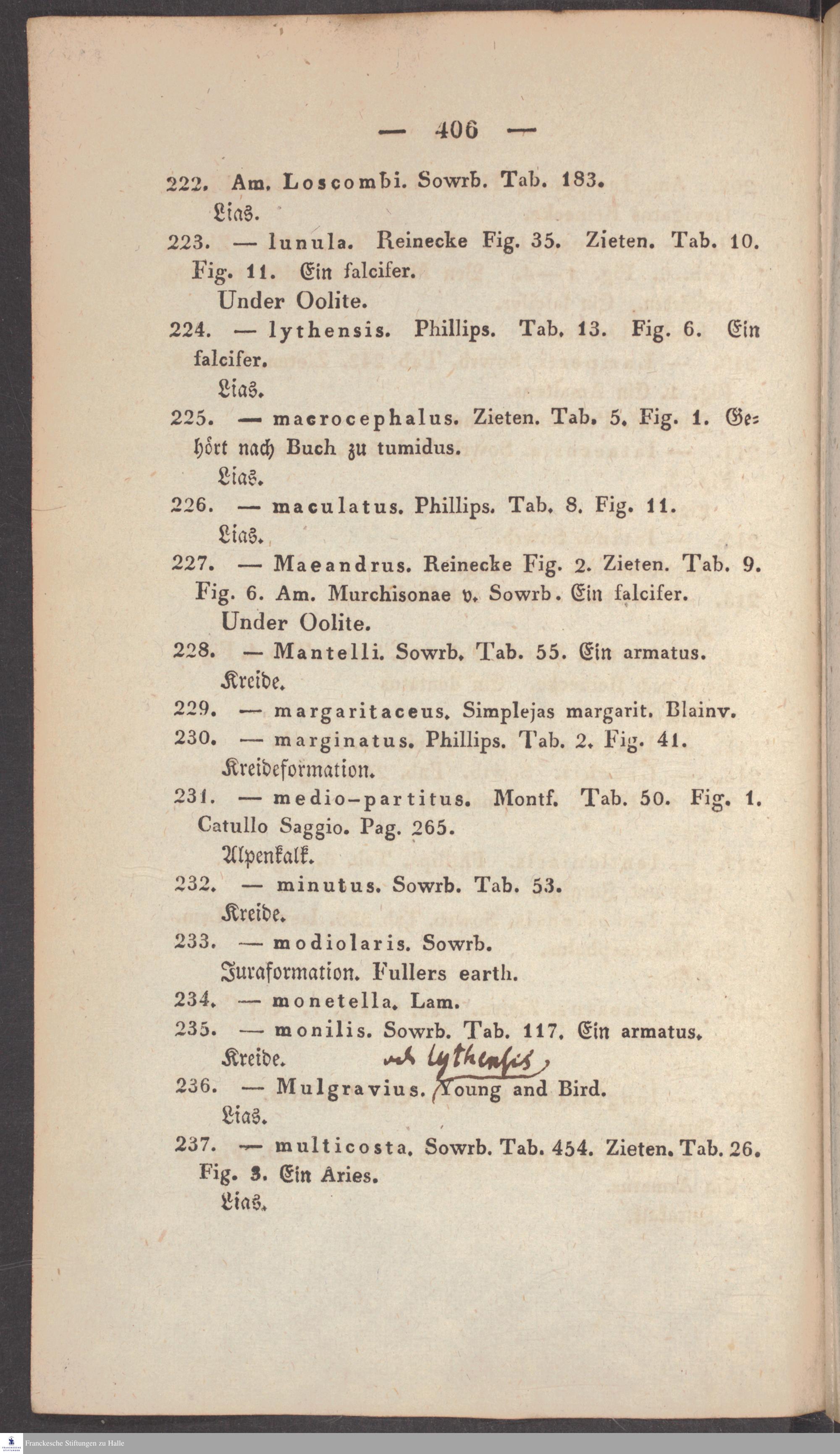 Handschriftliche Anmerkungen und Ergänzungen von Christian Keferstein in einem durchschossenen Exemplar seines Werks "Naturgeschichte des Erdkörpers. Band 2. Zweite Abtheilung. Achter Abschnitt. Die foßilen Mollusken".