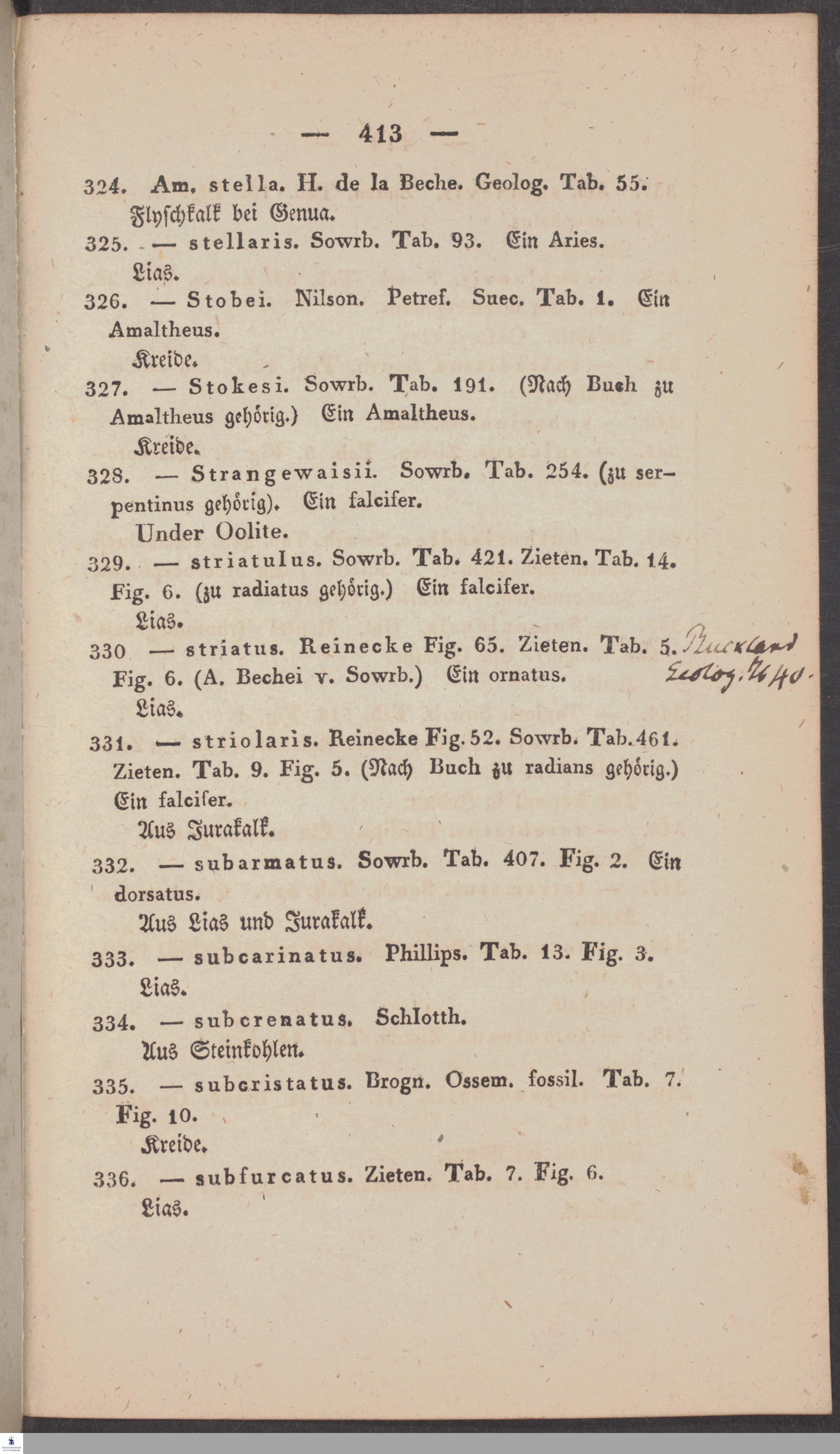 Handschriftliche Anmerkungen und Ergänzungen von Christian Keferstein in einem durchschossenen Exemplar seines Werks "Naturgeschichte des Erdkörpers. Band 2. Zweite Abtheilung. Achter Abschnitt. Die foßilen Mollusken".