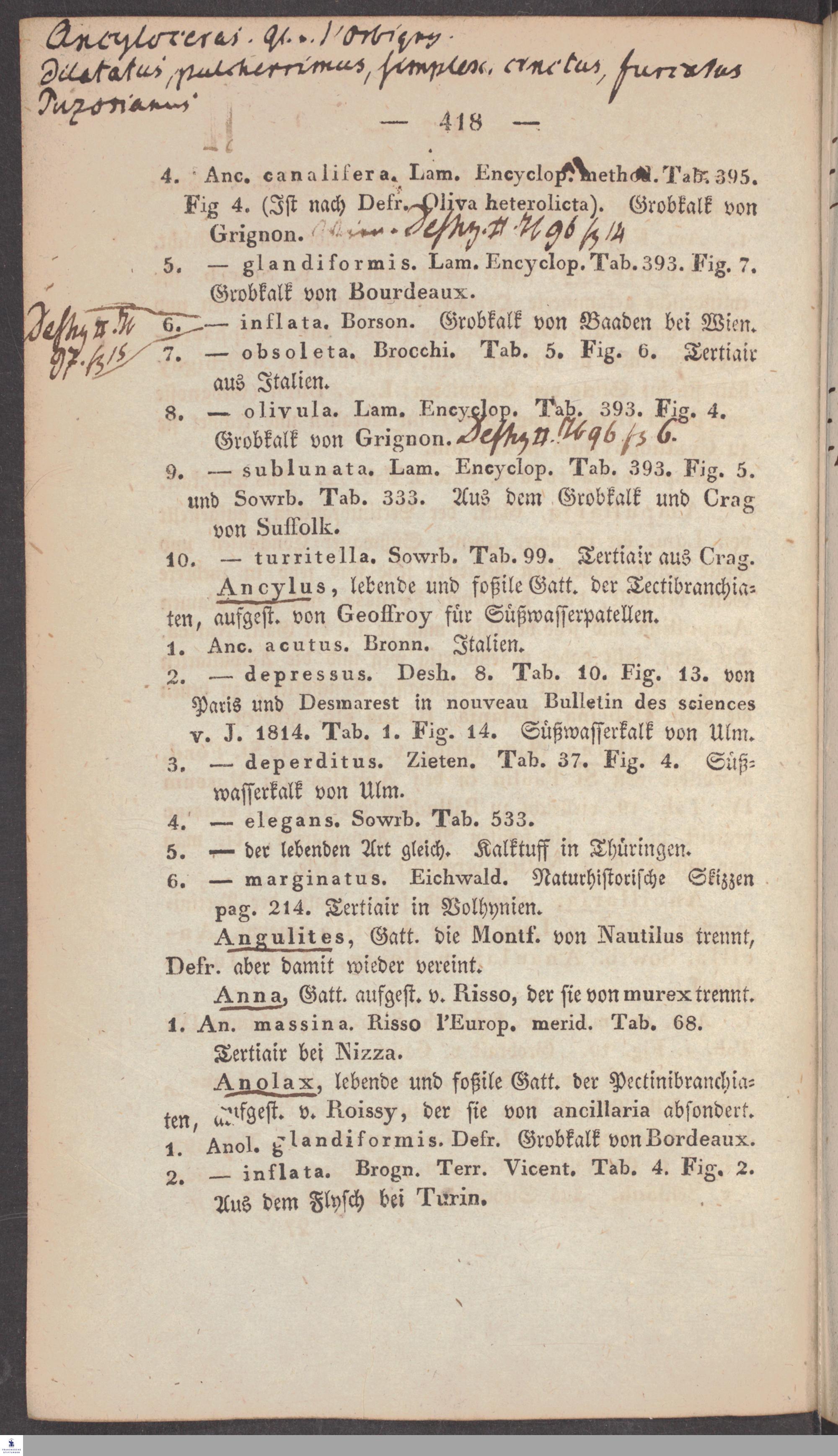 Handschriftliche Anmerkungen und Ergänzungen von Christian Keferstein in einem durchschossenen Exemplar seines Werks "Naturgeschichte des Erdkörpers. Band 2. Zweite Abtheilung. Achter Abschnitt. Die foßilen Mollusken".