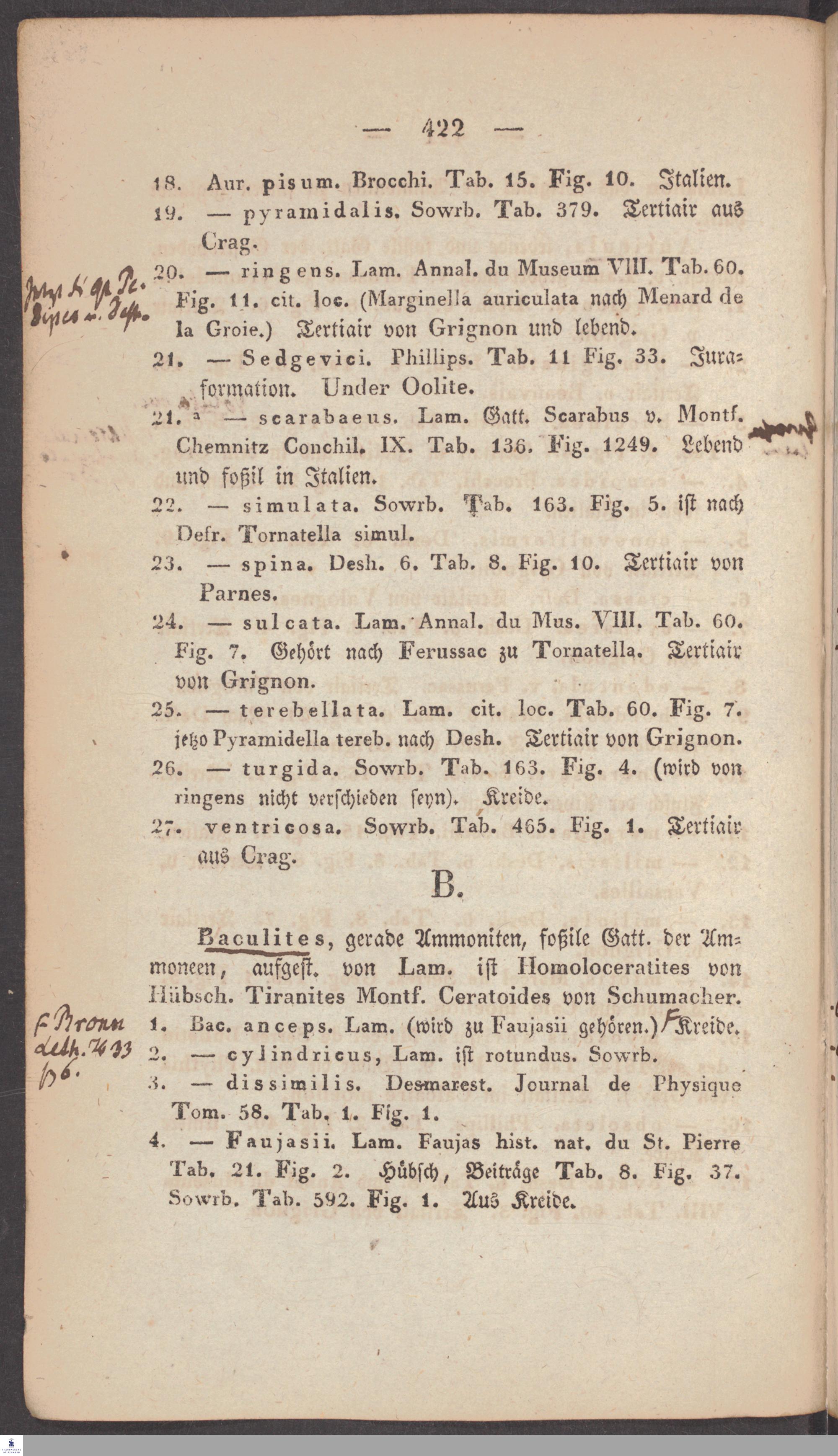 Handschriftliche Anmerkungen und Ergänzungen von Christian Keferstein in einem durchschossenen Exemplar seines Werks "Naturgeschichte des Erdkörpers. Band 2. Zweite Abtheilung. Achter Abschnitt. Die foßilen Mollusken".