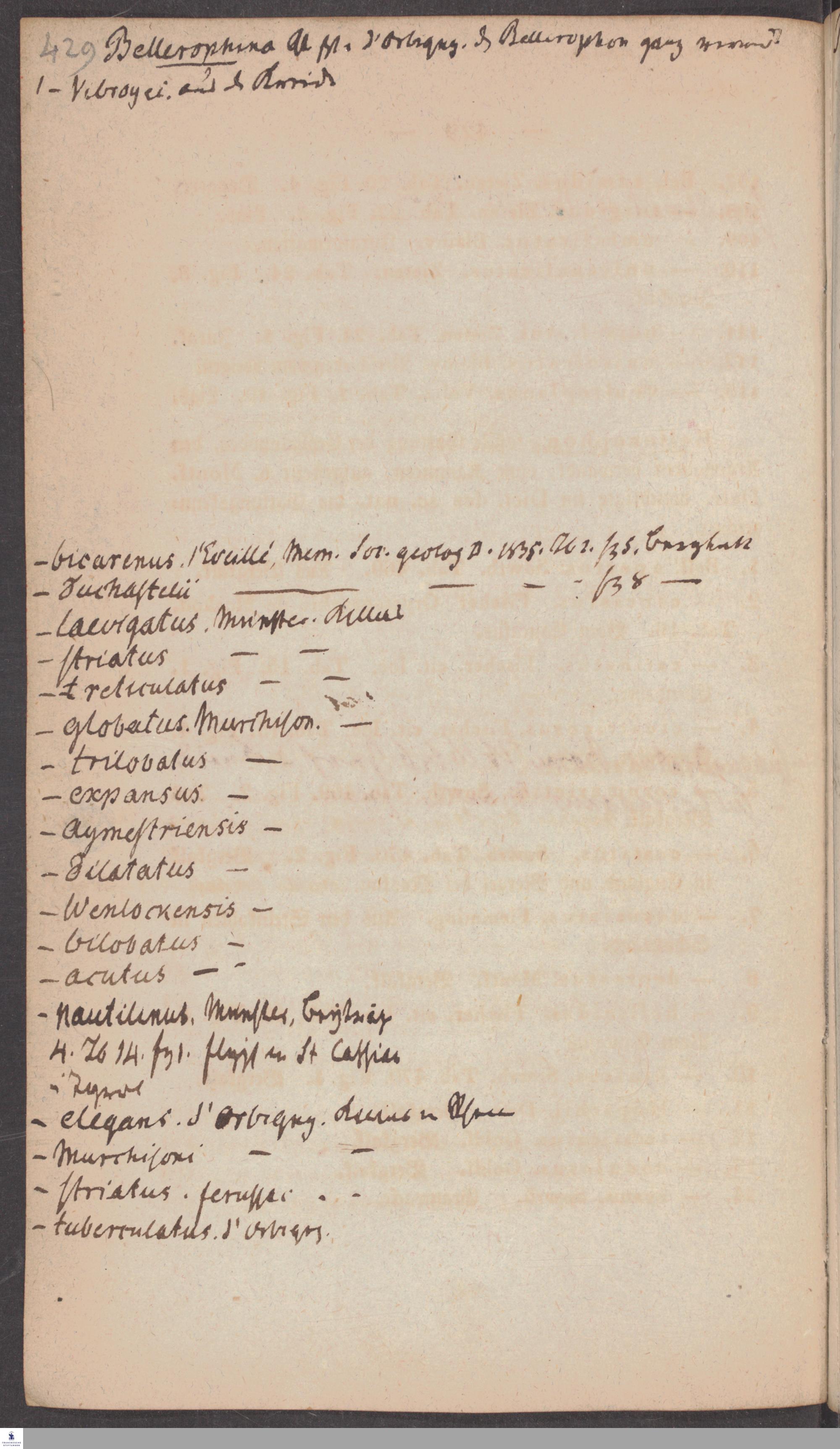 Handschriftliche Anmerkungen und Ergänzungen von Christian Keferstein in einem durchschossenen Exemplar seines Werks "Naturgeschichte des Erdkörpers. Band 2. Zweite Abtheilung. Achter Abschnitt. Die foßilen Mollusken".