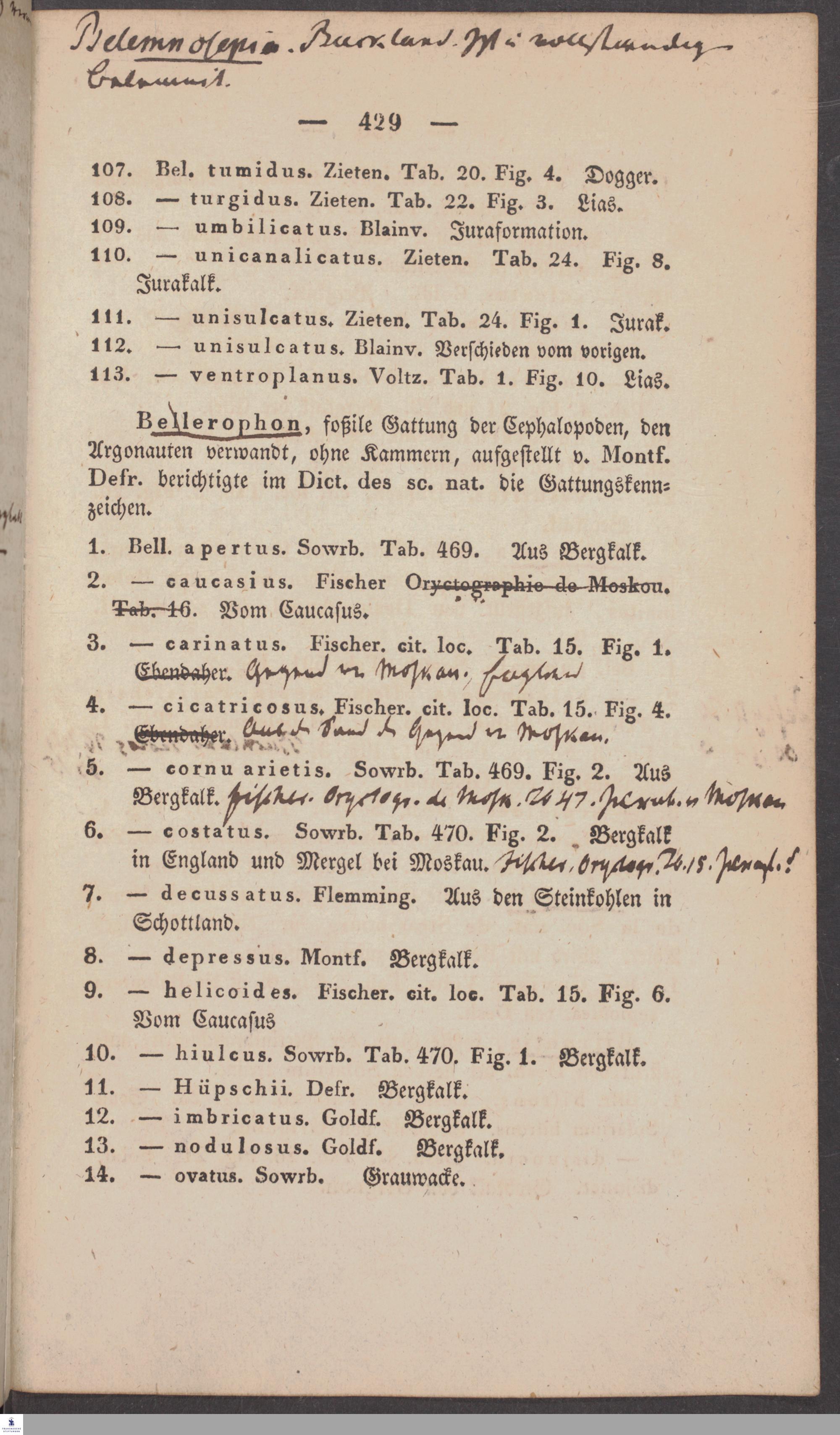 Handschriftliche Anmerkungen und Ergänzungen von Christian Keferstein in einem durchschossenen Exemplar seines Werks "Naturgeschichte des Erdkörpers. Band 2. Zweite Abtheilung. Achter Abschnitt. Die foßilen Mollusken".