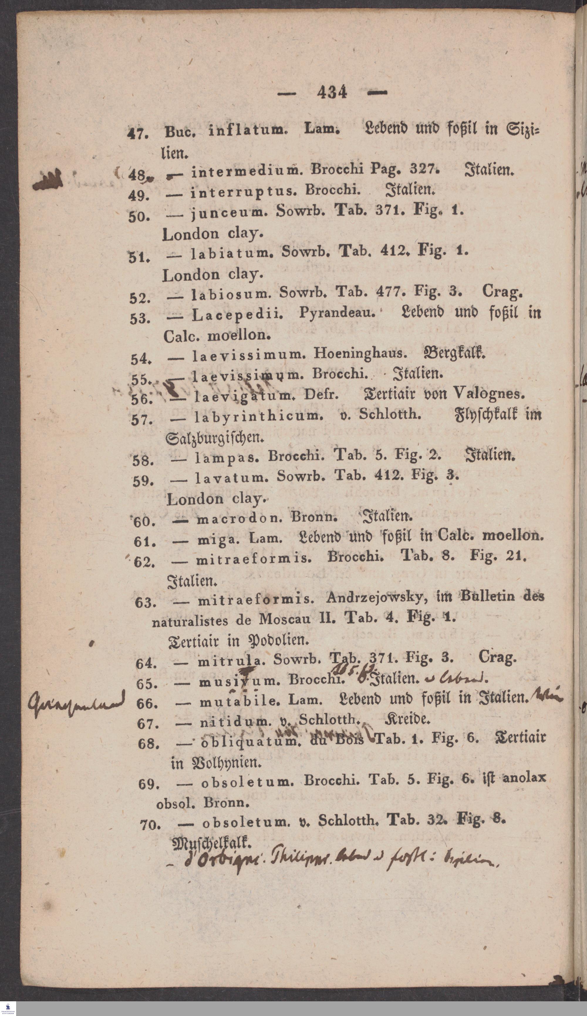 Handschriftliche Anmerkungen und Ergänzungen von Christian Keferstein in einem durchschossenen Exemplar seines Werks "Naturgeschichte des Erdkörpers. Band 2. Zweite Abtheilung. Achter Abschnitt. Die foßilen Mollusken".