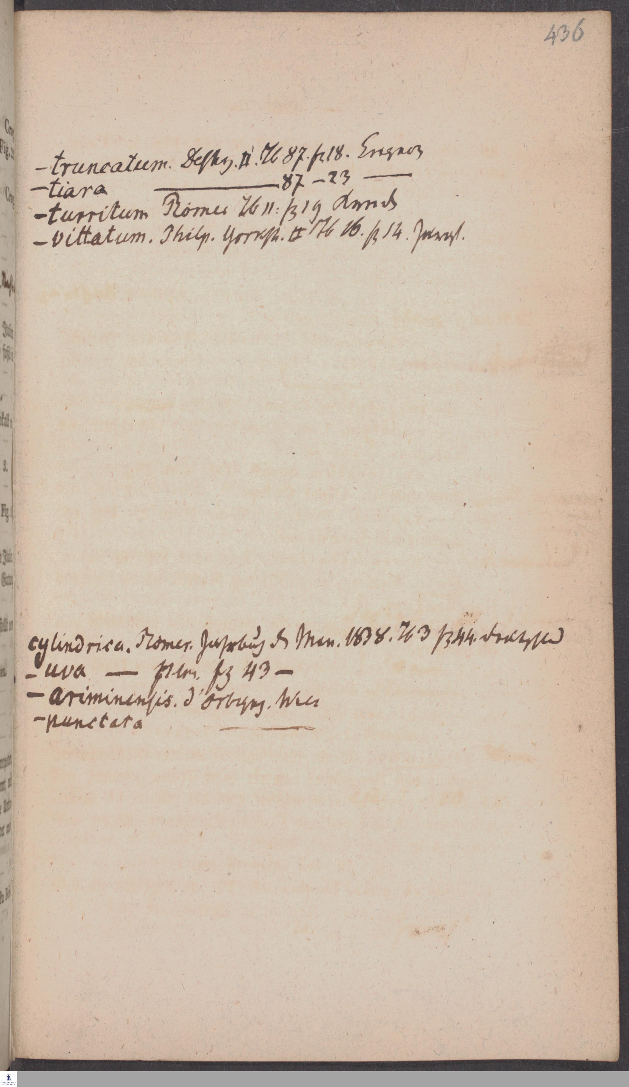 Handschriftliche Anmerkungen und Ergänzungen von Christian Keferstein in einem durchschossenen Exemplar seines Werks "Naturgeschichte des Erdkörpers. Band 2. Zweite Abtheilung. Achter Abschnitt. Die foßilen Mollusken".