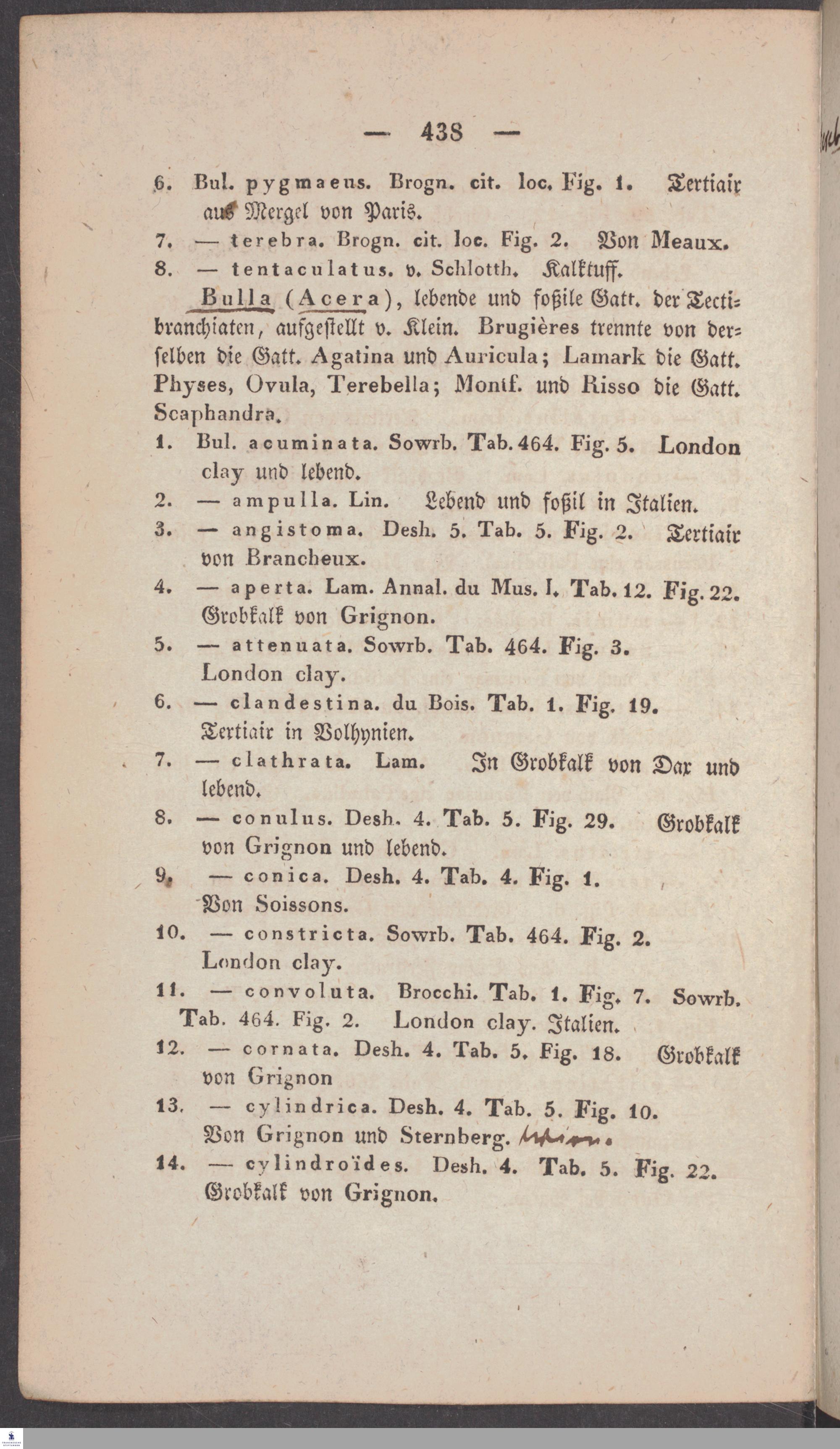 Handschriftliche Anmerkungen und Ergänzungen von Christian Keferstein in einem durchschossenen Exemplar seines Werks "Naturgeschichte des Erdkörpers. Band 2. Zweite Abtheilung. Achter Abschnitt. Die foßilen Mollusken".