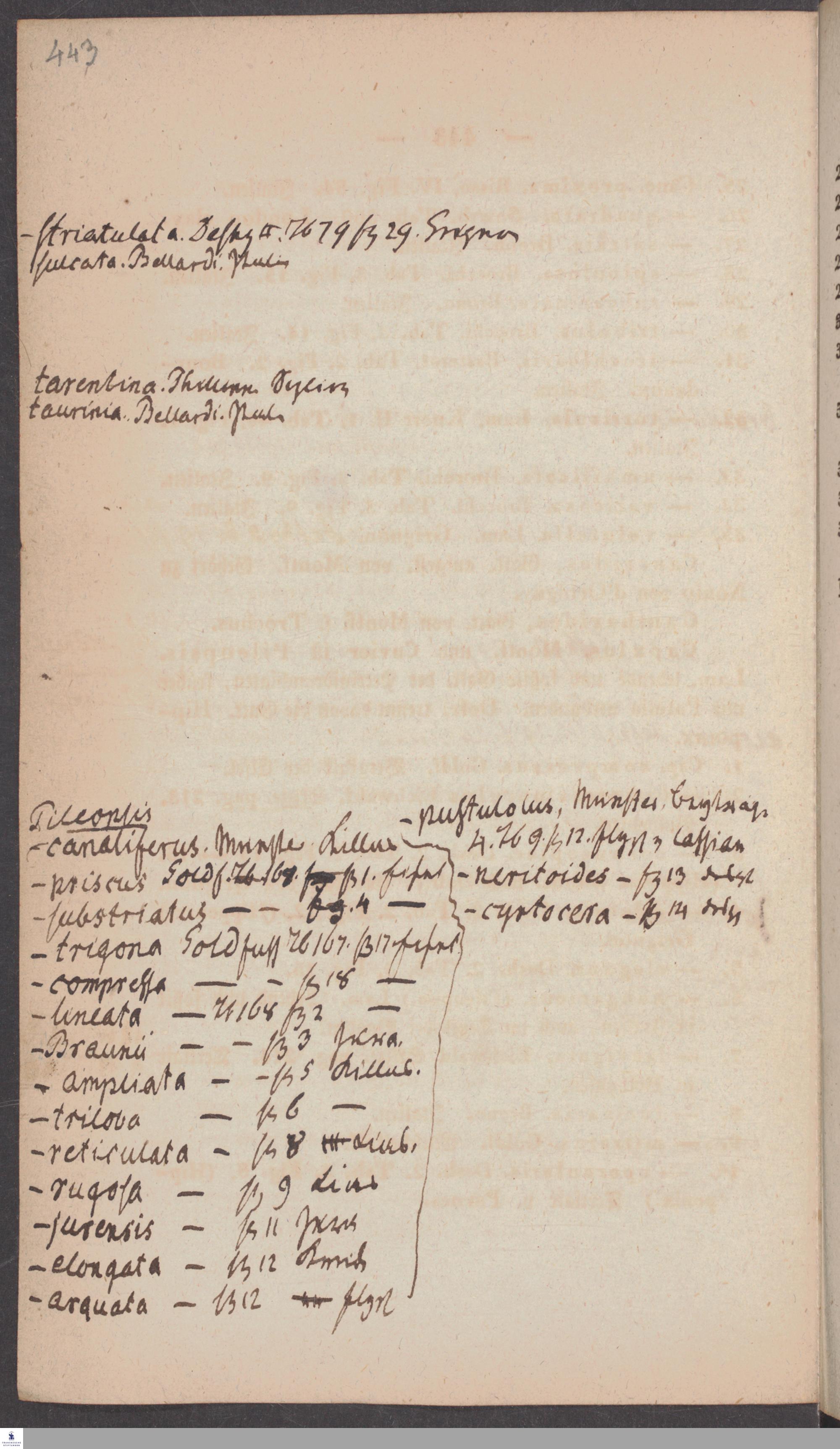Handschriftliche Anmerkungen und Ergänzungen von Christian Keferstein in einem durchschossenen Exemplar seines Werks "Naturgeschichte des Erdkörpers. Band 2. Zweite Abtheilung. Achter Abschnitt. Die foßilen Mollusken".