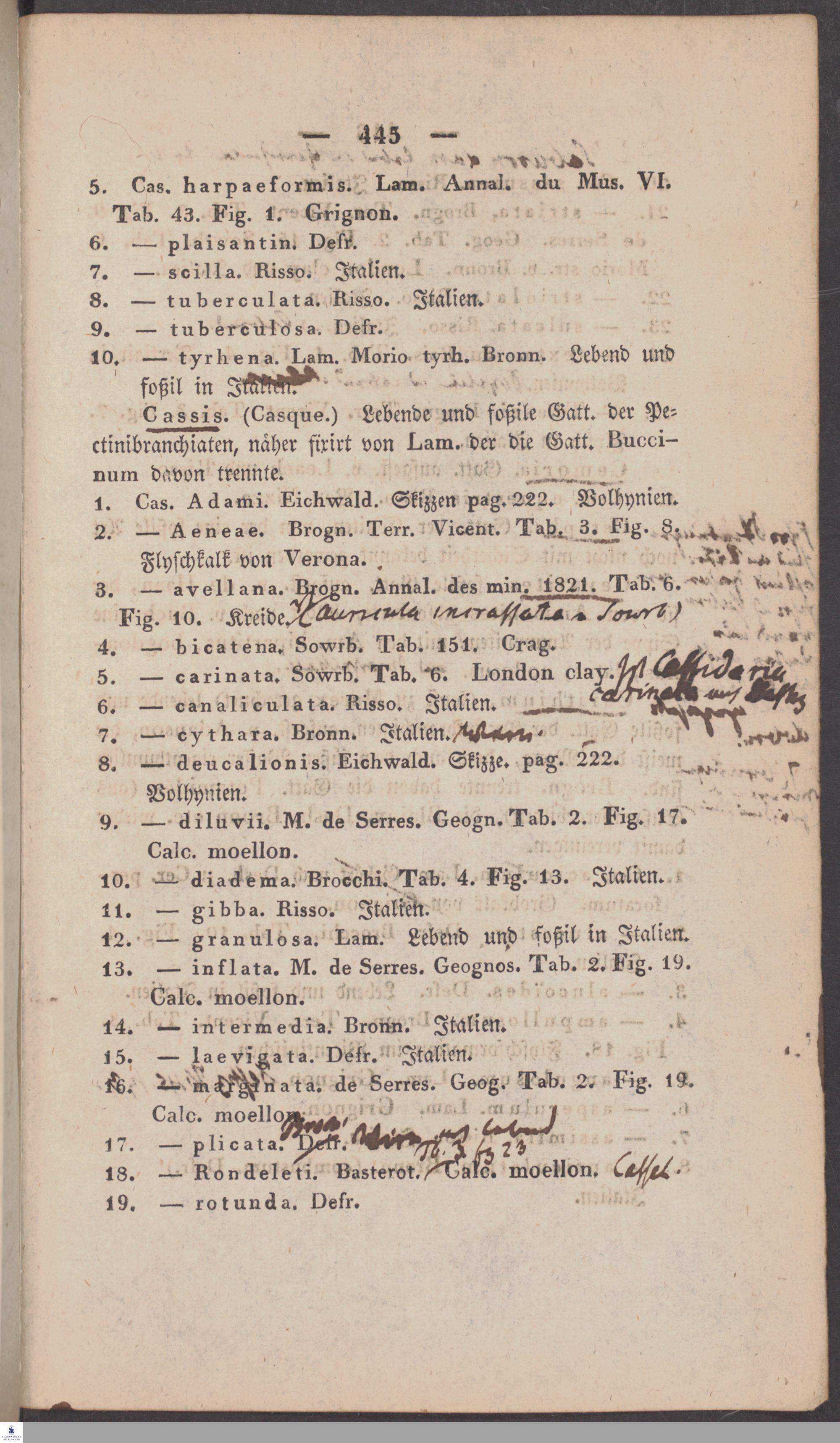Handschriftliche Anmerkungen und Ergänzungen von Christian Keferstein in einem durchschossenen Exemplar seines Werks "Naturgeschichte des Erdkörpers. Band 2. Zweite Abtheilung. Achter Abschnitt. Die foßilen Mollusken".