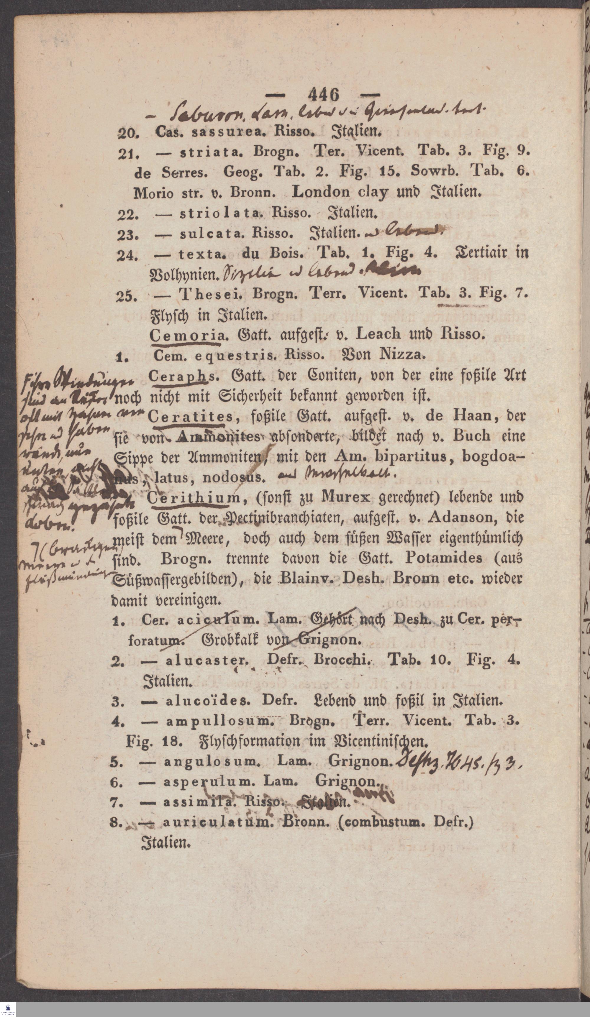Handschriftliche Anmerkungen und Ergänzungen von Christian Keferstein in einem durchschossenen Exemplar seines Werks "Naturgeschichte des Erdkörpers. Band 2. Zweite Abtheilung. Achter Abschnitt. Die foßilen Mollusken".