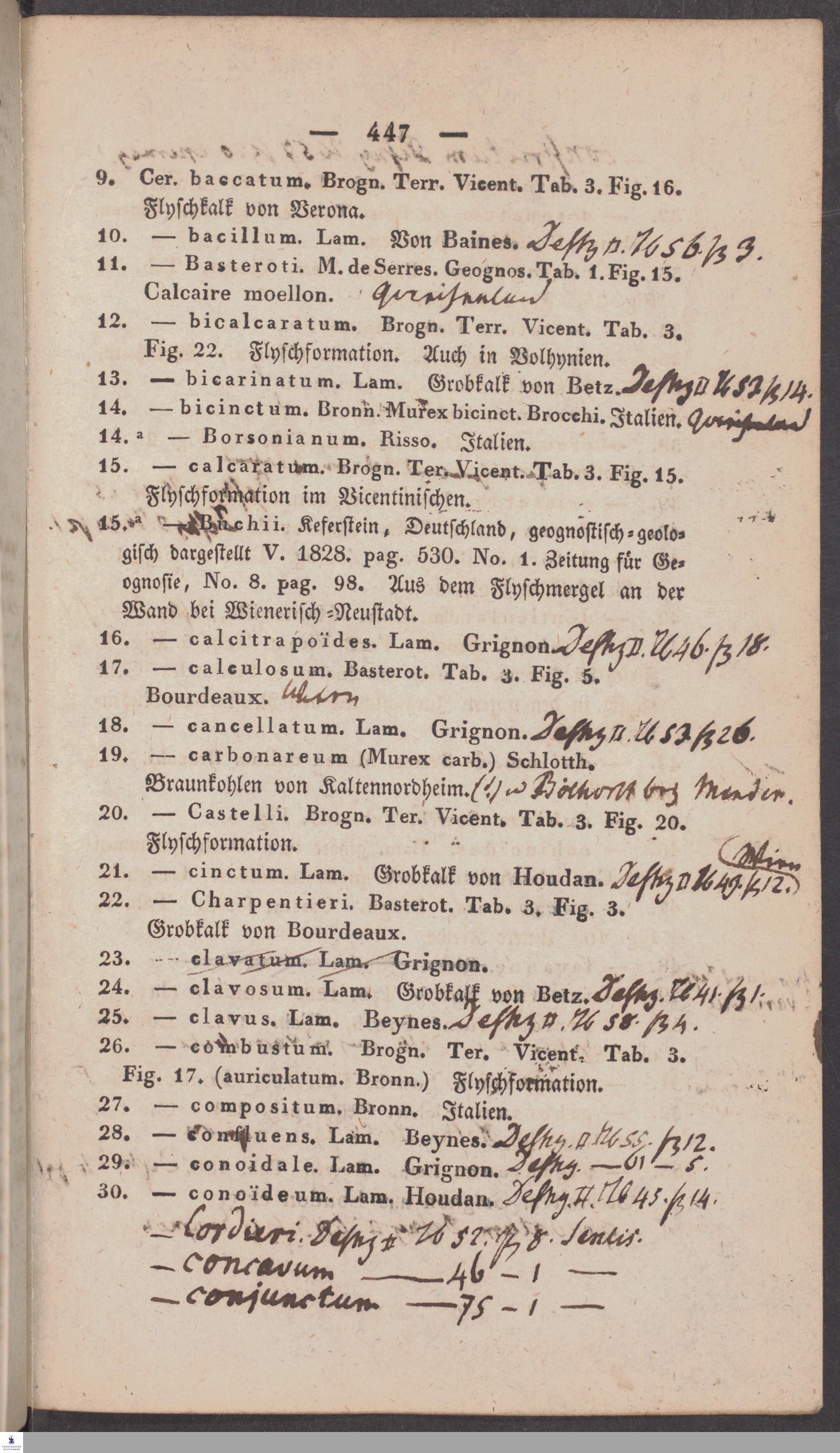 Handschriftliche Anmerkungen und Ergänzungen von Christian Keferstein in einem durchschossenen Exemplar seines Werks "Naturgeschichte des Erdkörpers. Band 2. Zweite Abtheilung. Achter Abschnitt. Die foßilen Mollusken".