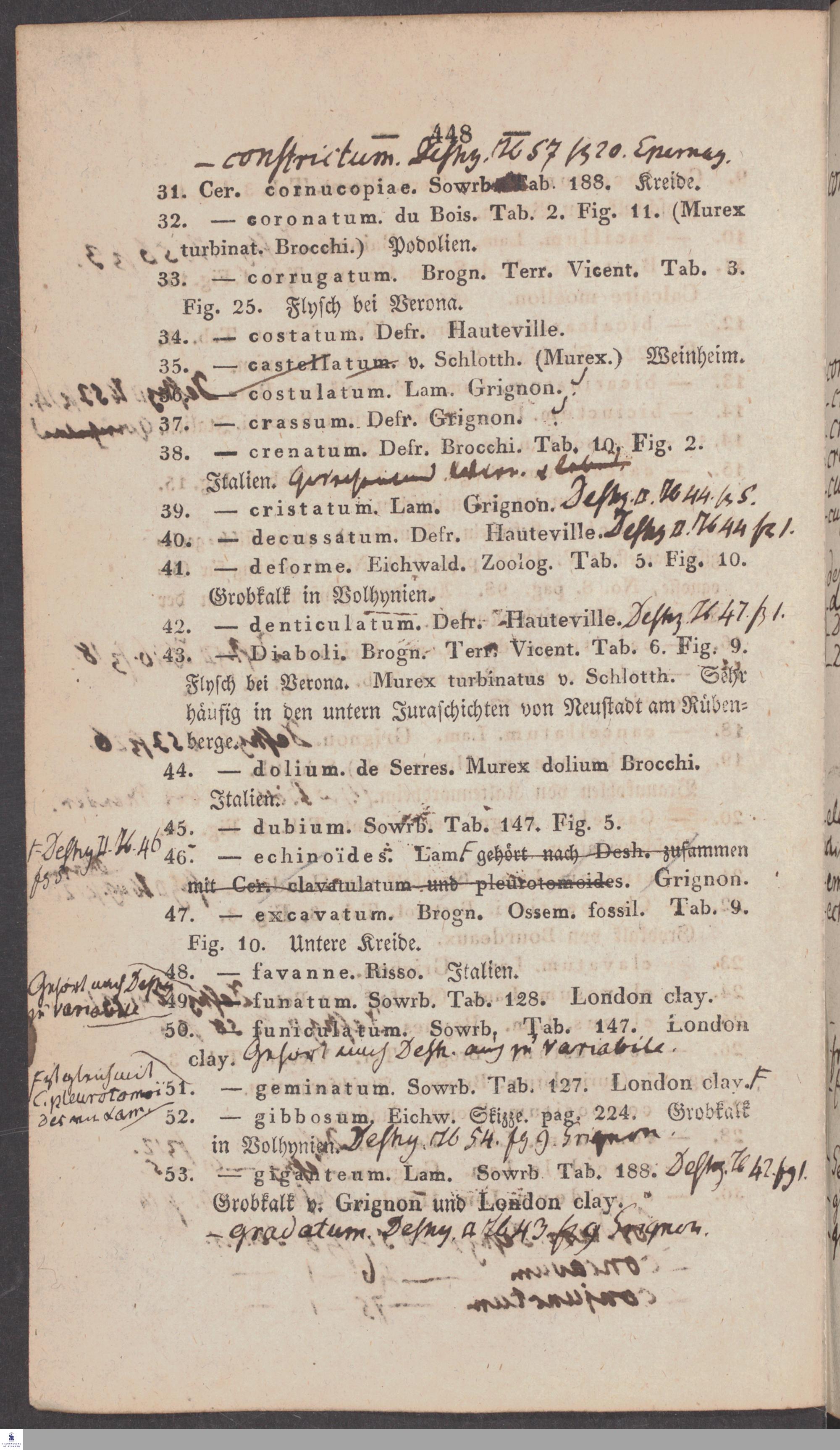 Handschriftliche Anmerkungen und Ergänzungen von Christian Keferstein in einem durchschossenen Exemplar seines Werks "Naturgeschichte des Erdkörpers. Band 2. Zweite Abtheilung. Achter Abschnitt. Die foßilen Mollusken".