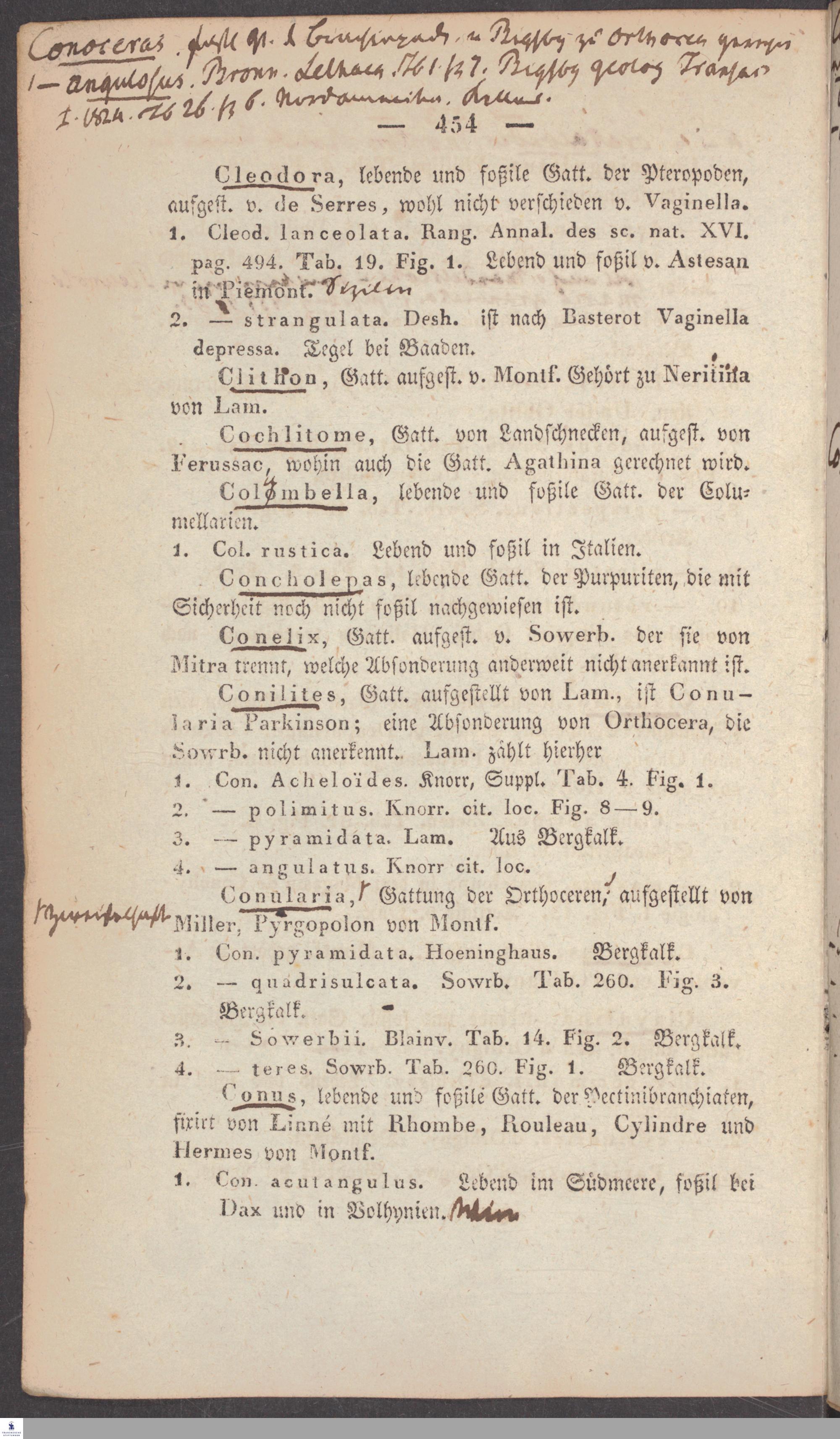 Handschriftliche Anmerkungen und Ergänzungen von Christian Keferstein in einem durchschossenen Exemplar seines Werks "Naturgeschichte des Erdkörpers. Band 2. Zweite Abtheilung. Achter Abschnitt. Die foßilen Mollusken".