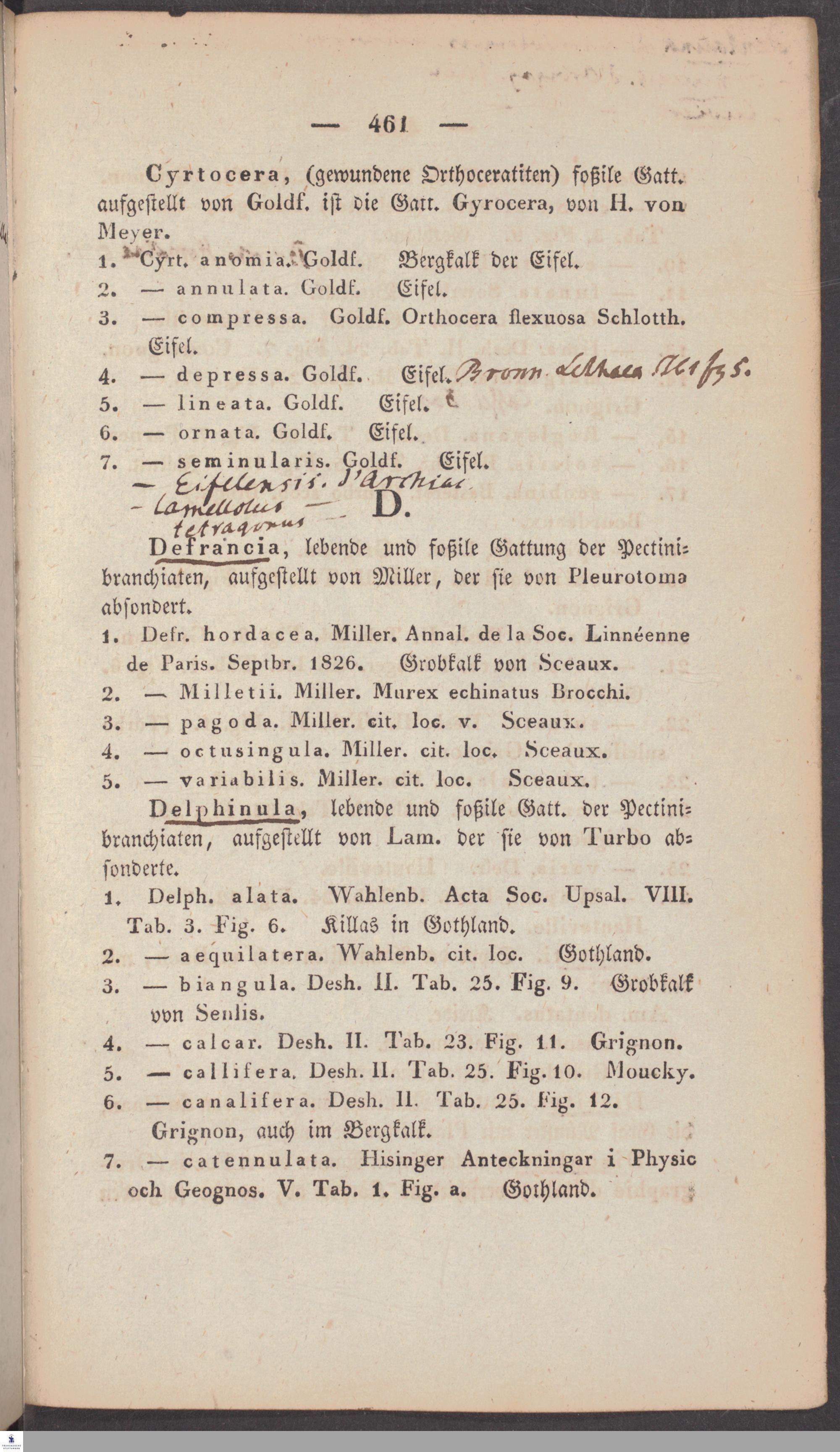 Handschriftliche Anmerkungen und Ergänzungen von Christian Keferstein in einem durchschossenen Exemplar seines Werks "Naturgeschichte des Erdkörpers. Band 2. Zweite Abtheilung. Achter Abschnitt. Die foßilen Mollusken".