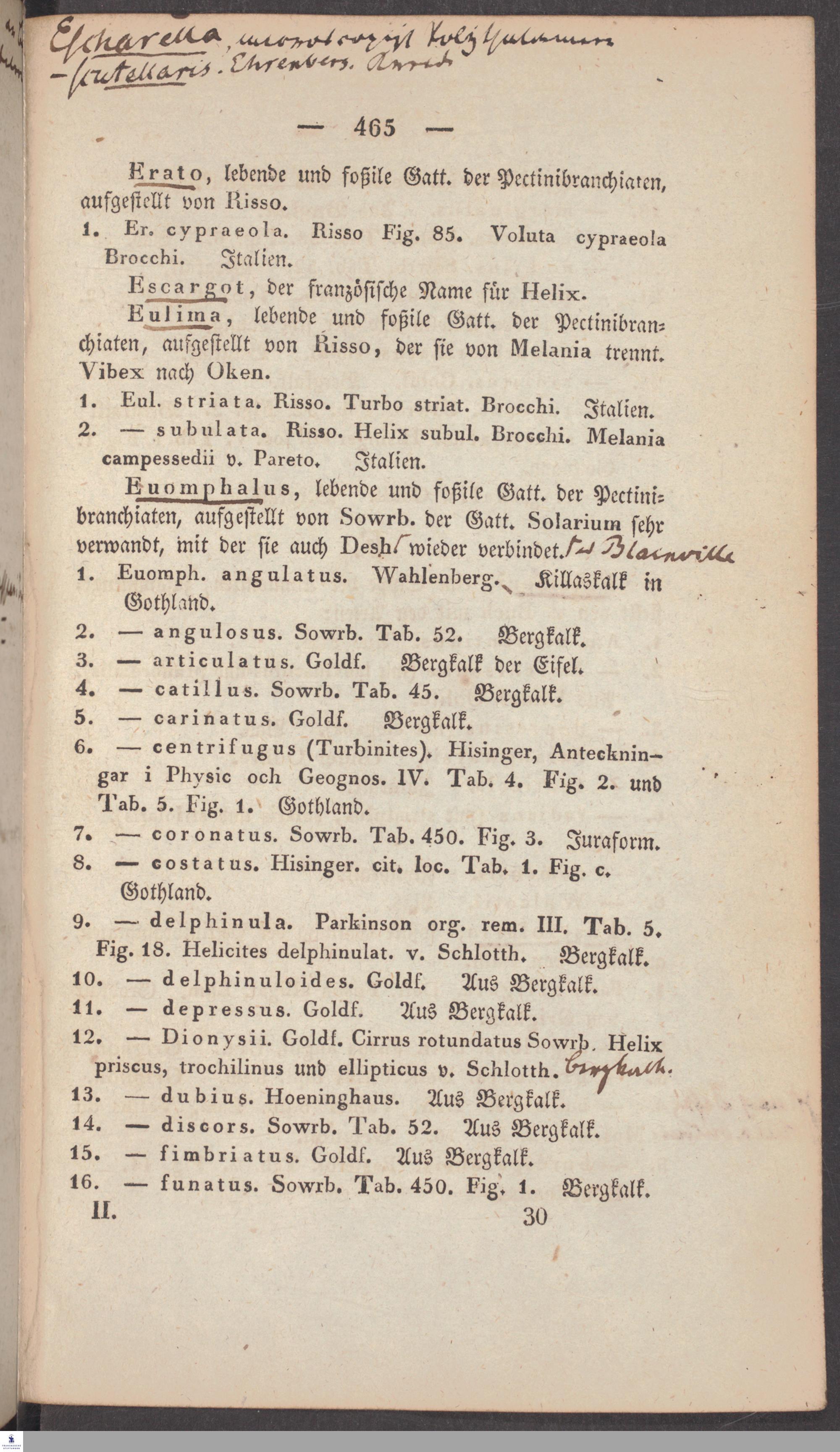 Handschriftliche Anmerkungen und Ergänzungen von Christian Keferstein in einem durchschossenen Exemplar seines Werks "Naturgeschichte des Erdkörpers. Band 2. Zweite Abtheilung. Achter Abschnitt. Die foßilen Mollusken".