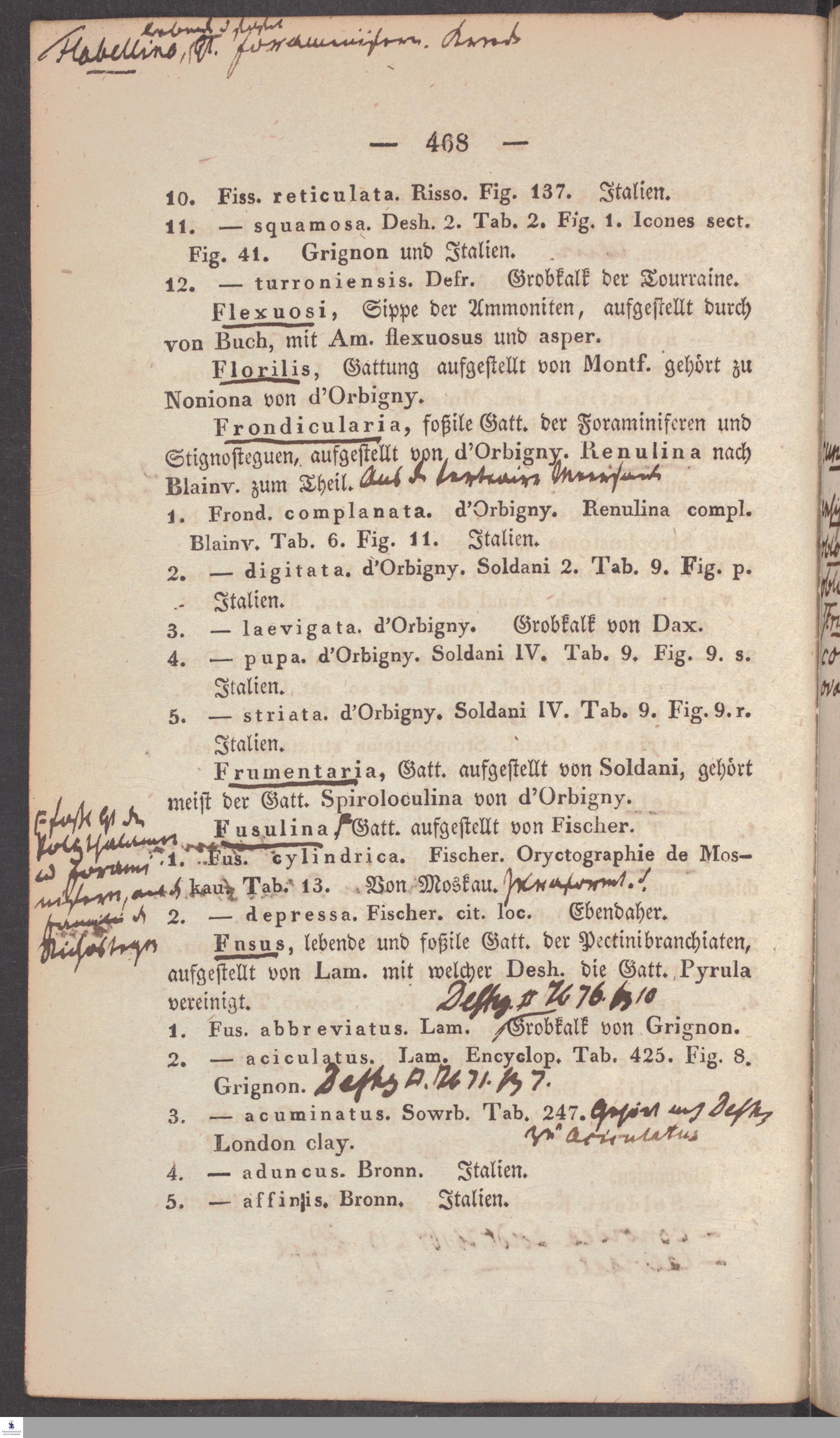 Handschriftliche Anmerkungen und Ergänzungen von Christian Keferstein in einem durchschossenen Exemplar seines Werks "Naturgeschichte des Erdkörpers. Band 2. Zweite Abtheilung. Achter Abschnitt. Die foßilen Mollusken".