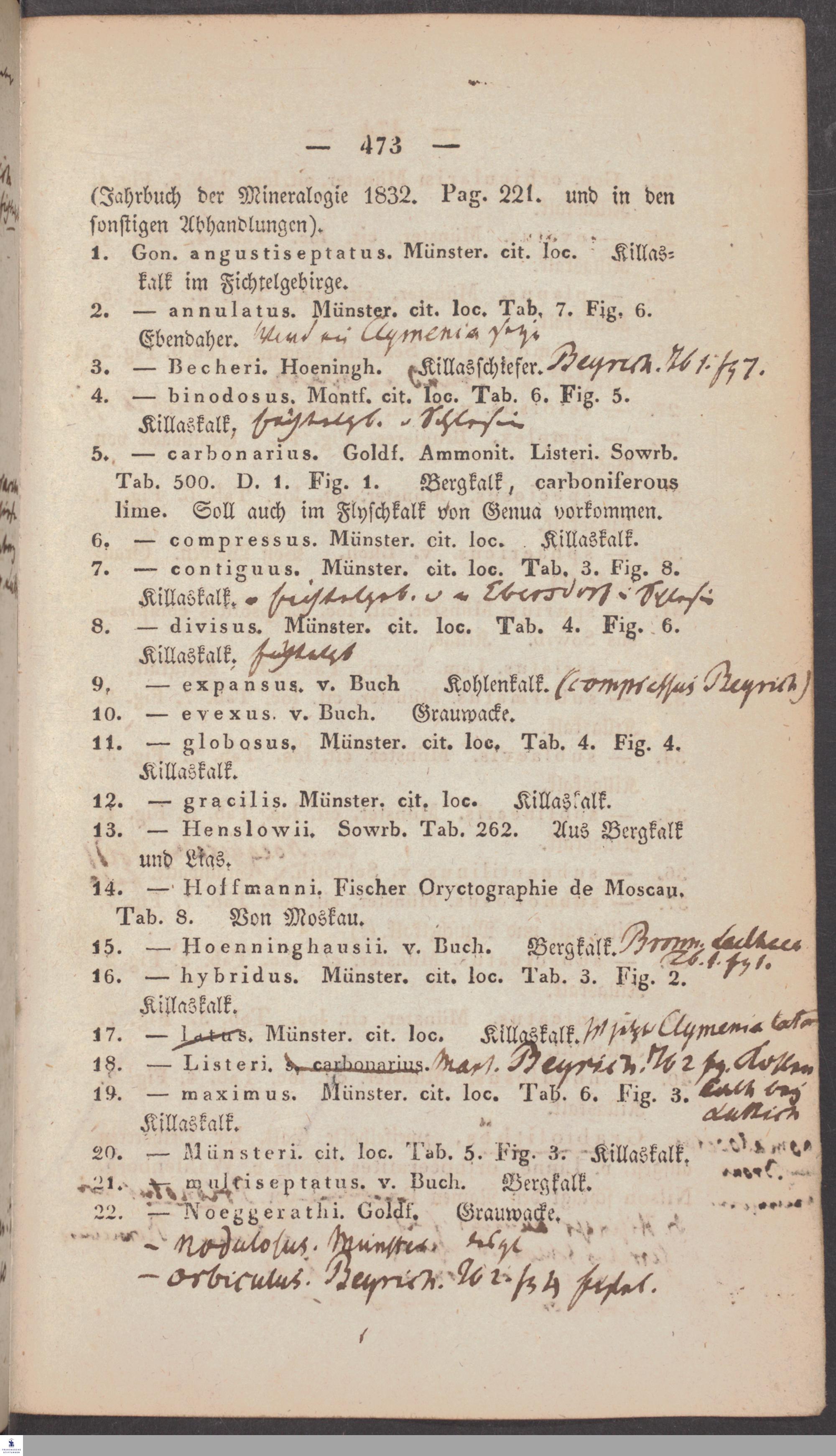 Handschriftliche Anmerkungen und Ergänzungen von Christian Keferstein in einem durchschossenen Exemplar seines Werks "Naturgeschichte des Erdkörpers. Band 2. Zweite Abtheilung. Achter Abschnitt. Die foßilen Mollusken".