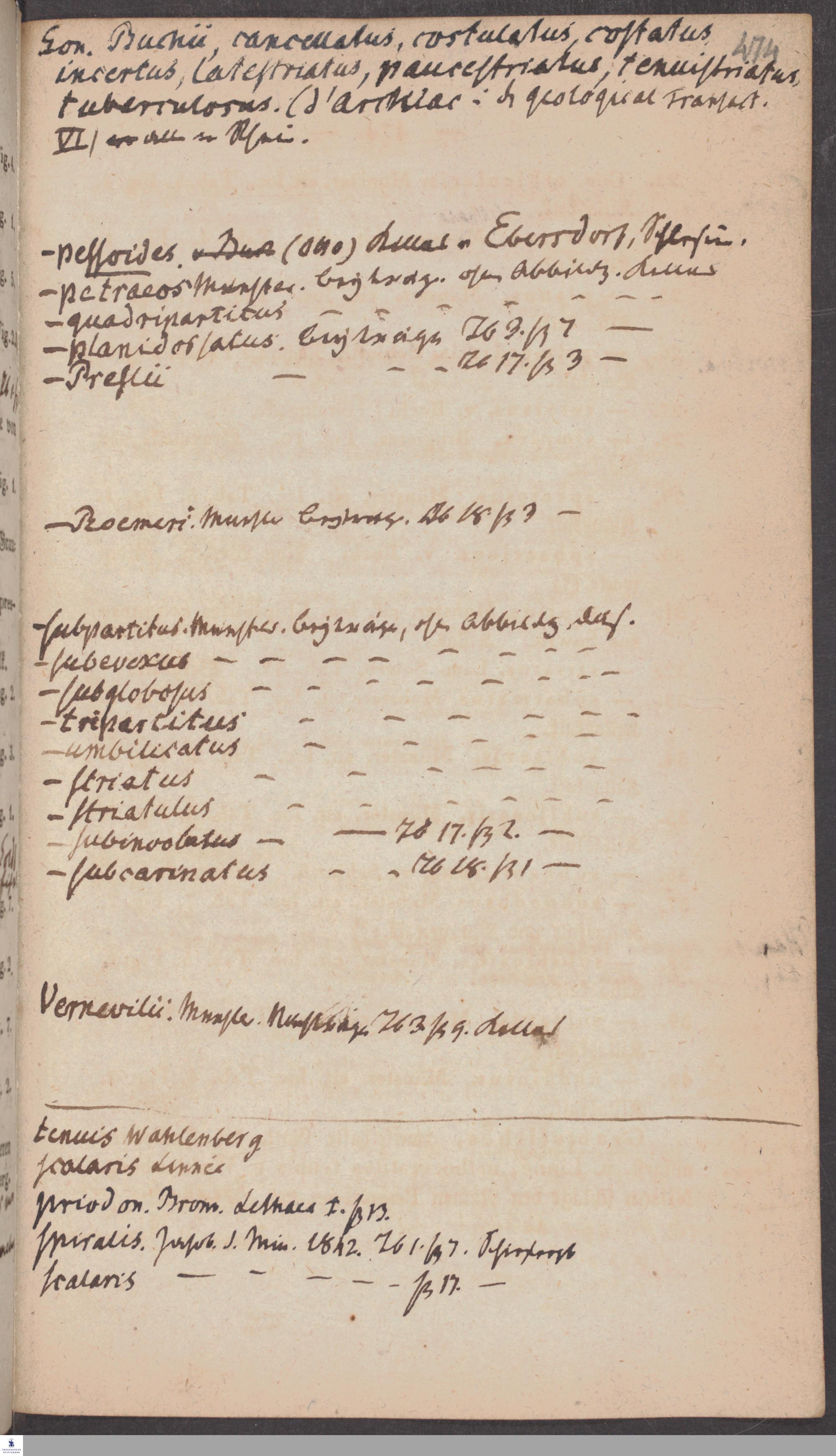 Handschriftliche Anmerkungen und Ergänzungen von Christian Keferstein in einem durchschossenen Exemplar seines Werks "Naturgeschichte des Erdkörpers. Band 2. Zweite Abtheilung. Achter Abschnitt. Die foßilen Mollusken".