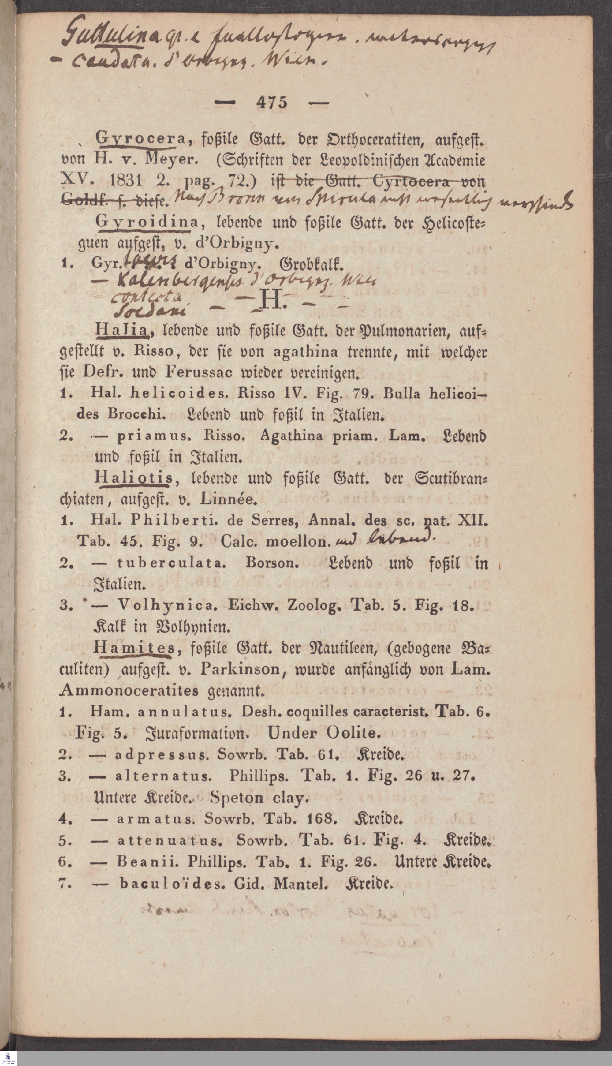 Handschriftliche Anmerkungen und Ergänzungen von Christian Keferstein in einem durchschossenen Exemplar seines Werks "Naturgeschichte des Erdkörpers. Band 2. Zweite Abtheilung. Achter Abschnitt. Die foßilen Mollusken".