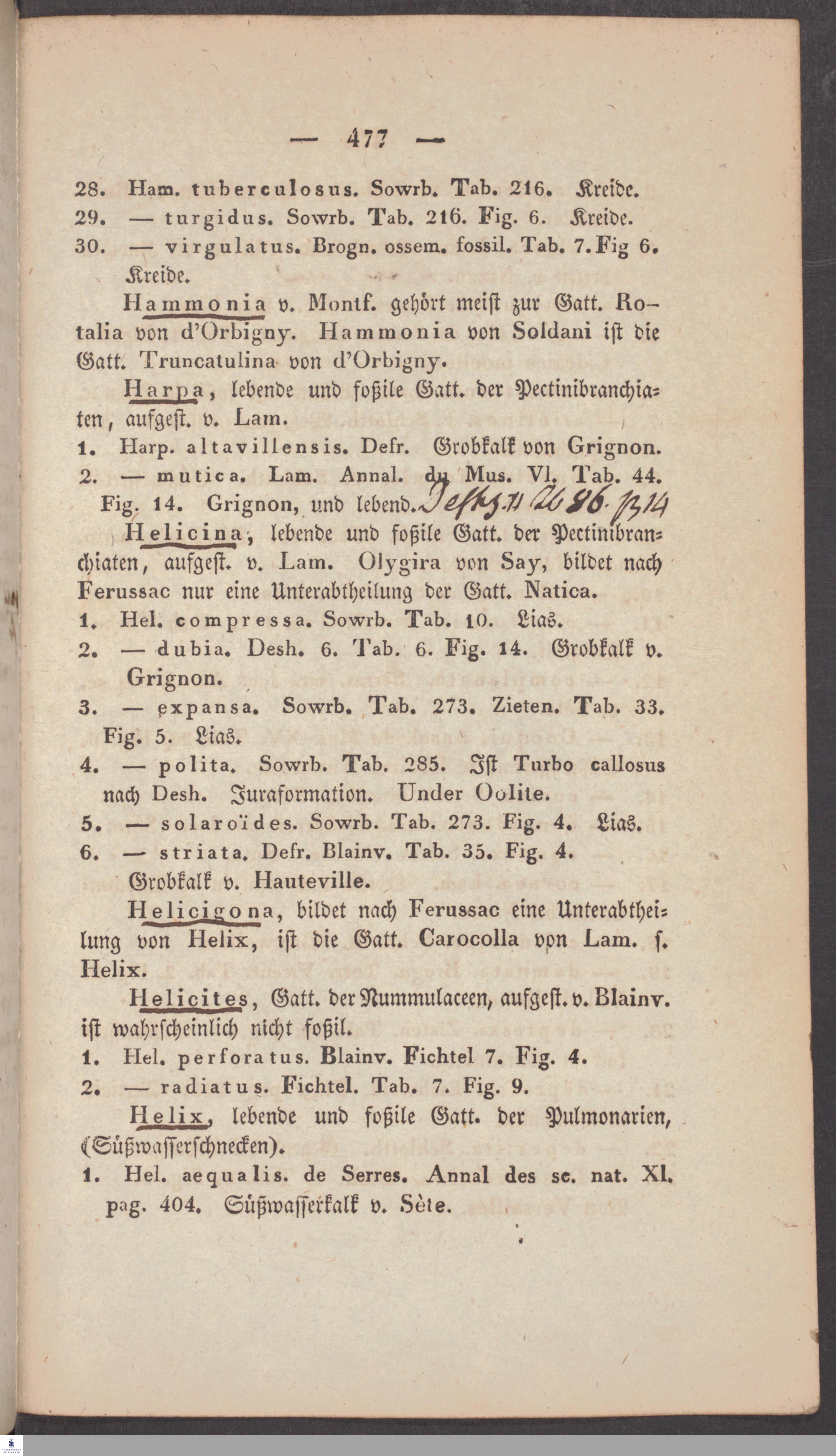 Handschriftliche Anmerkungen und Ergänzungen von Christian Keferstein in einem durchschossenen Exemplar seines Werks "Naturgeschichte des Erdkörpers. Band 2. Zweite Abtheilung. Achter Abschnitt. Die foßilen Mollusken".