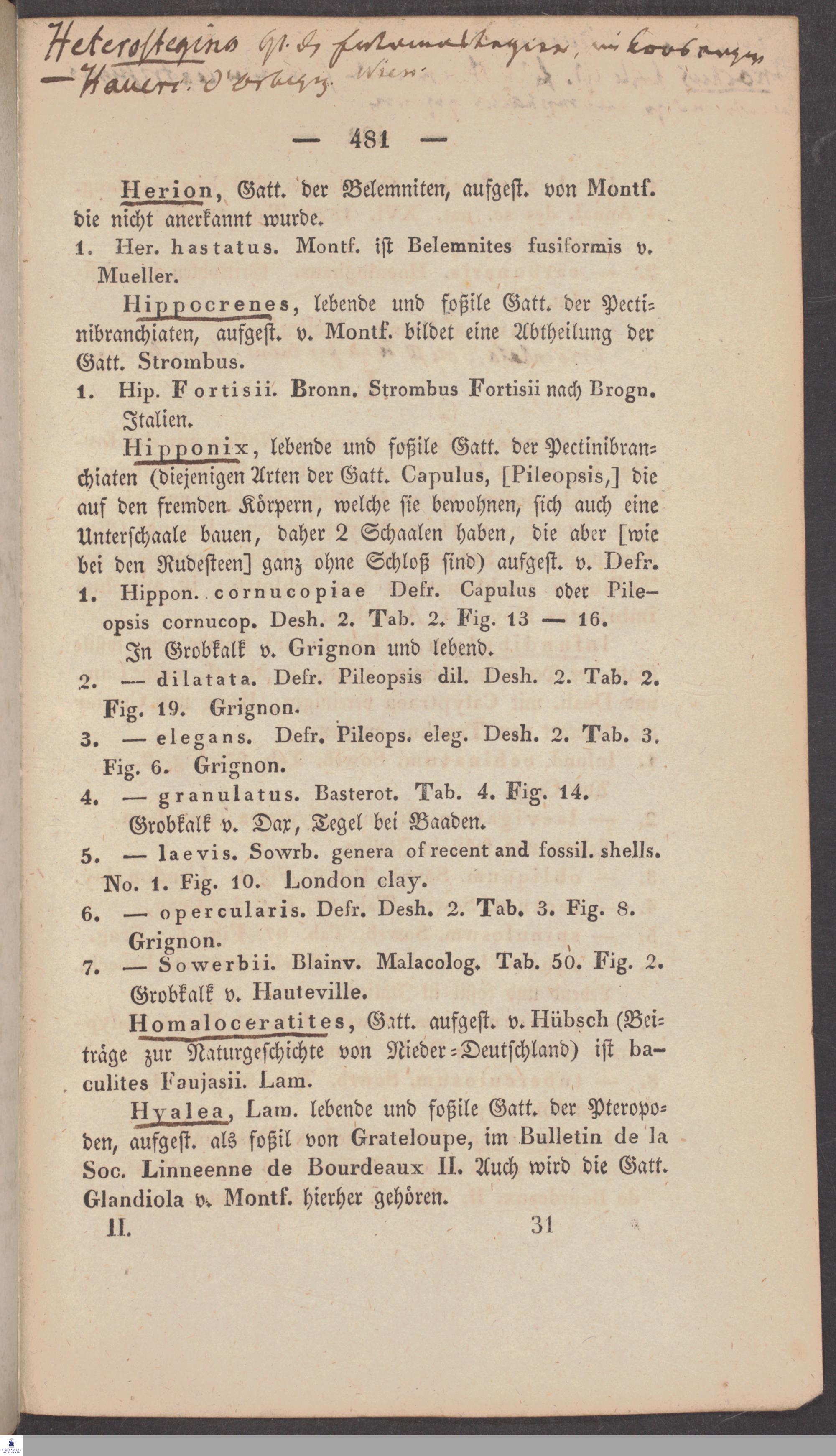 Handschriftliche Anmerkungen und Ergänzungen von Christian Keferstein in einem durchschossenen Exemplar seines Werks "Naturgeschichte des Erdkörpers. Band 2. Zweite Abtheilung. Achter Abschnitt. Die foßilen Mollusken".