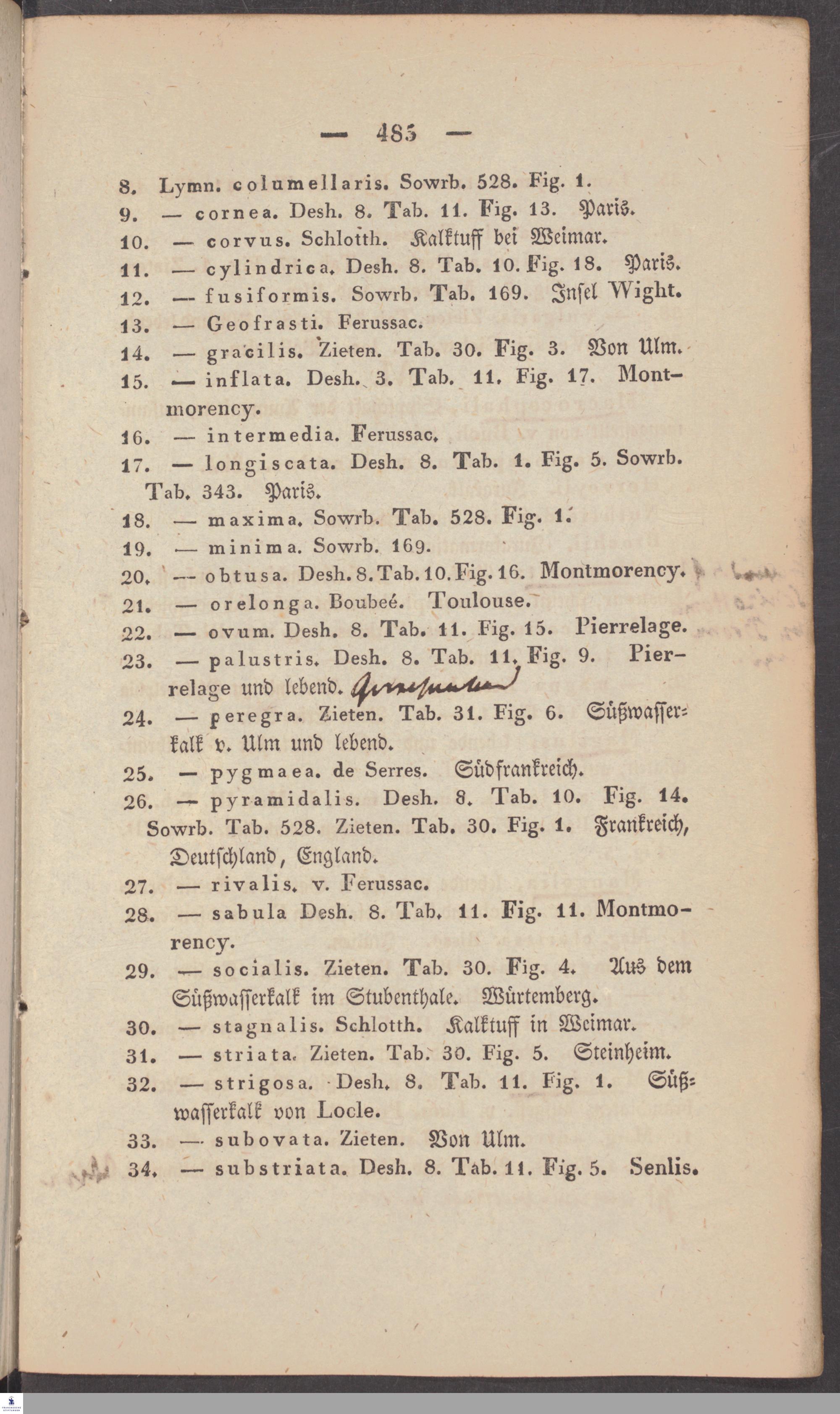 Handschriftliche Anmerkungen und Ergänzungen von Christian Keferstein in einem durchschossenen Exemplar seines Werks "Naturgeschichte des Erdkörpers. Band 2. Zweite Abtheilung. Achter Abschnitt. Die foßilen Mollusken".