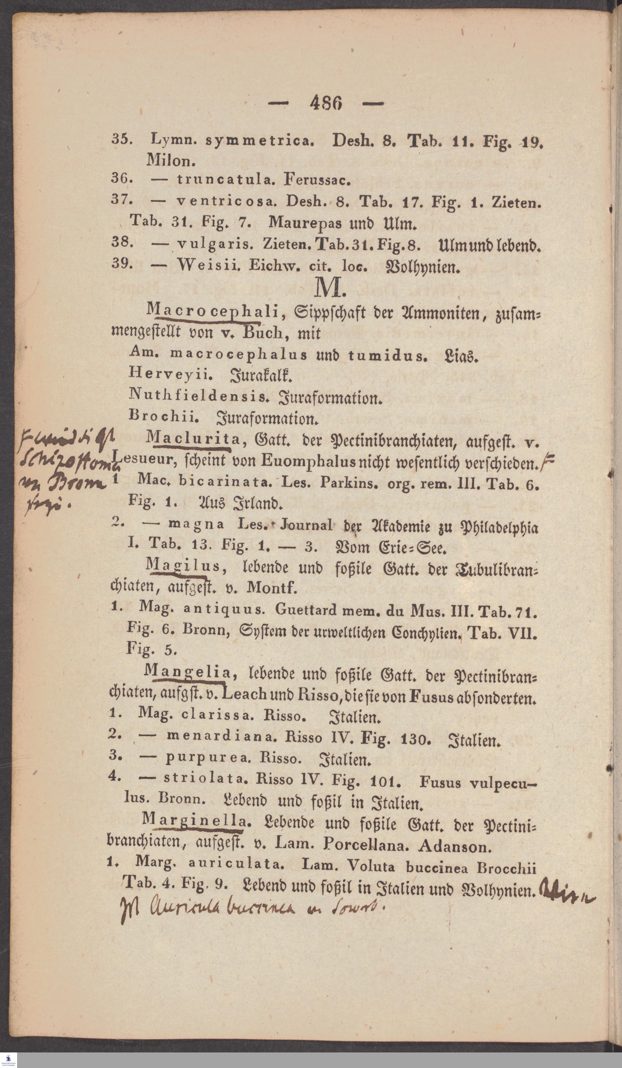 Handschriftliche Anmerkungen und Ergänzungen von Christian Keferstein in einem durchschossenen Exemplar seines Werks "Naturgeschichte des Erdkörpers. Band 2. Zweite Abtheilung. Achter Abschnitt. Die foßilen Mollusken".