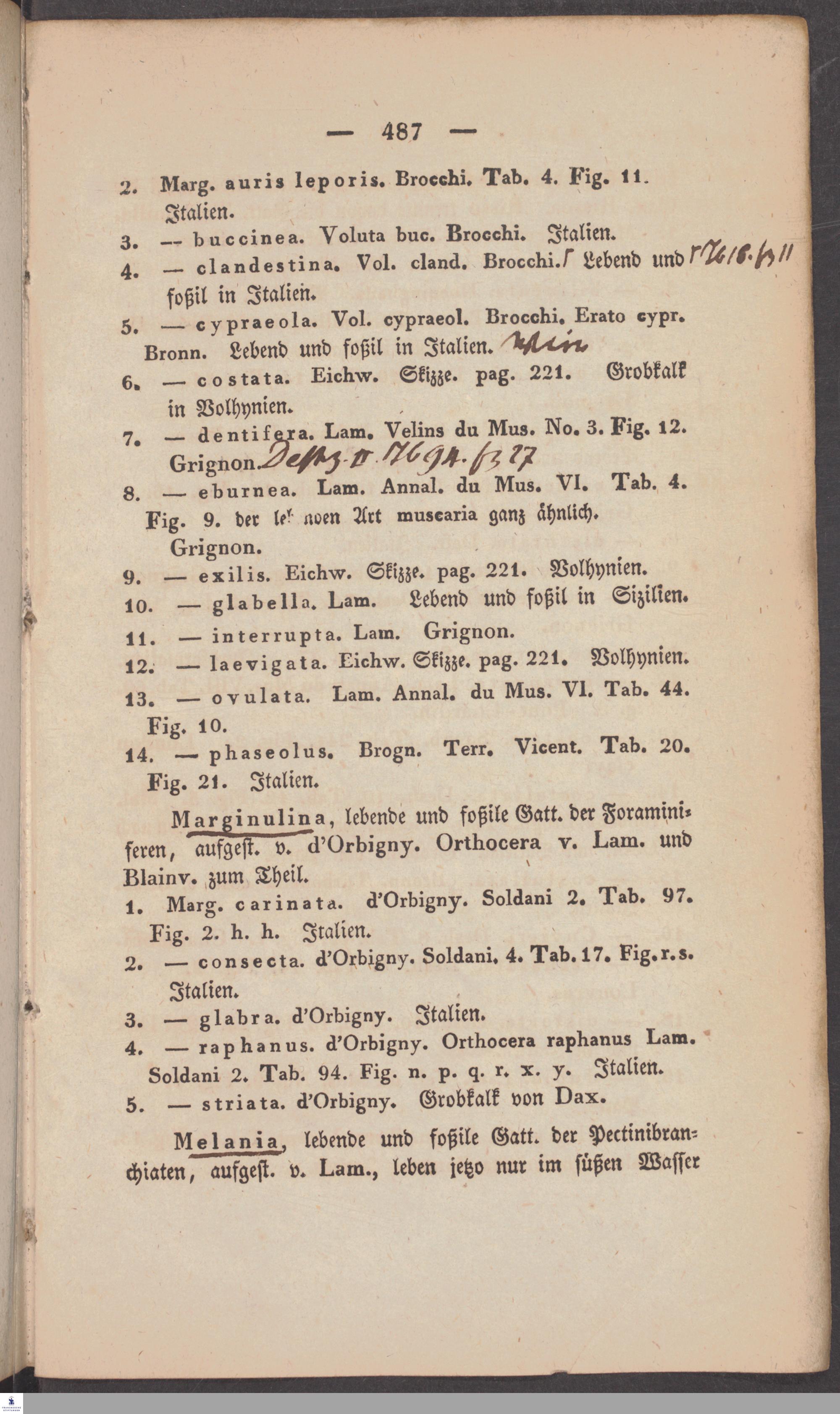 Handschriftliche Anmerkungen und Ergänzungen von Christian Keferstein in einem durchschossenen Exemplar seines Werks "Naturgeschichte des Erdkörpers. Band 2. Zweite Abtheilung. Achter Abschnitt. Die foßilen Mollusken".