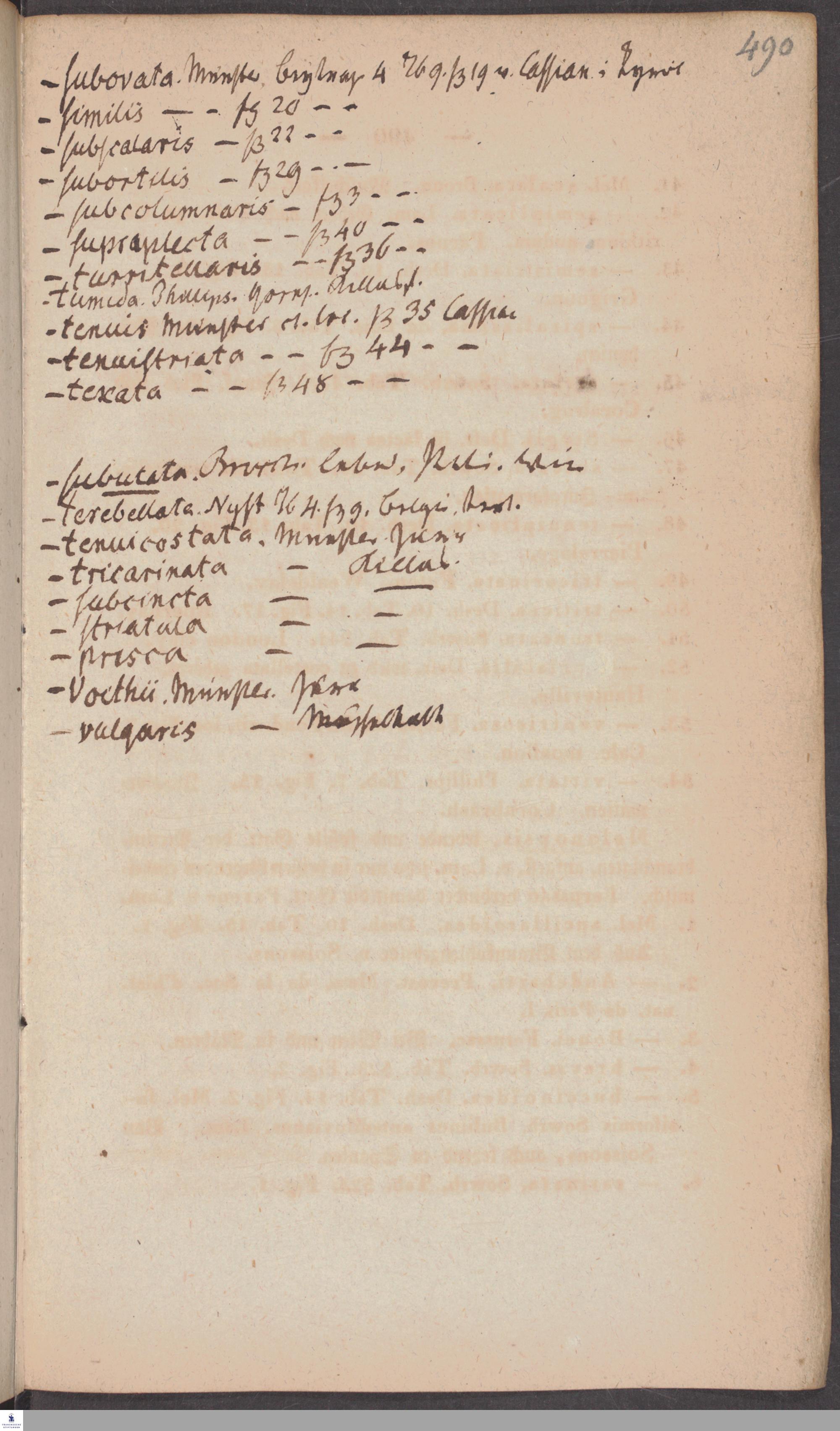 Handschriftliche Anmerkungen und Ergänzungen von Christian Keferstein in einem durchschossenen Exemplar seines Werks "Naturgeschichte des Erdkörpers. Band 2. Zweite Abtheilung. Achter Abschnitt. Die foßilen Mollusken".