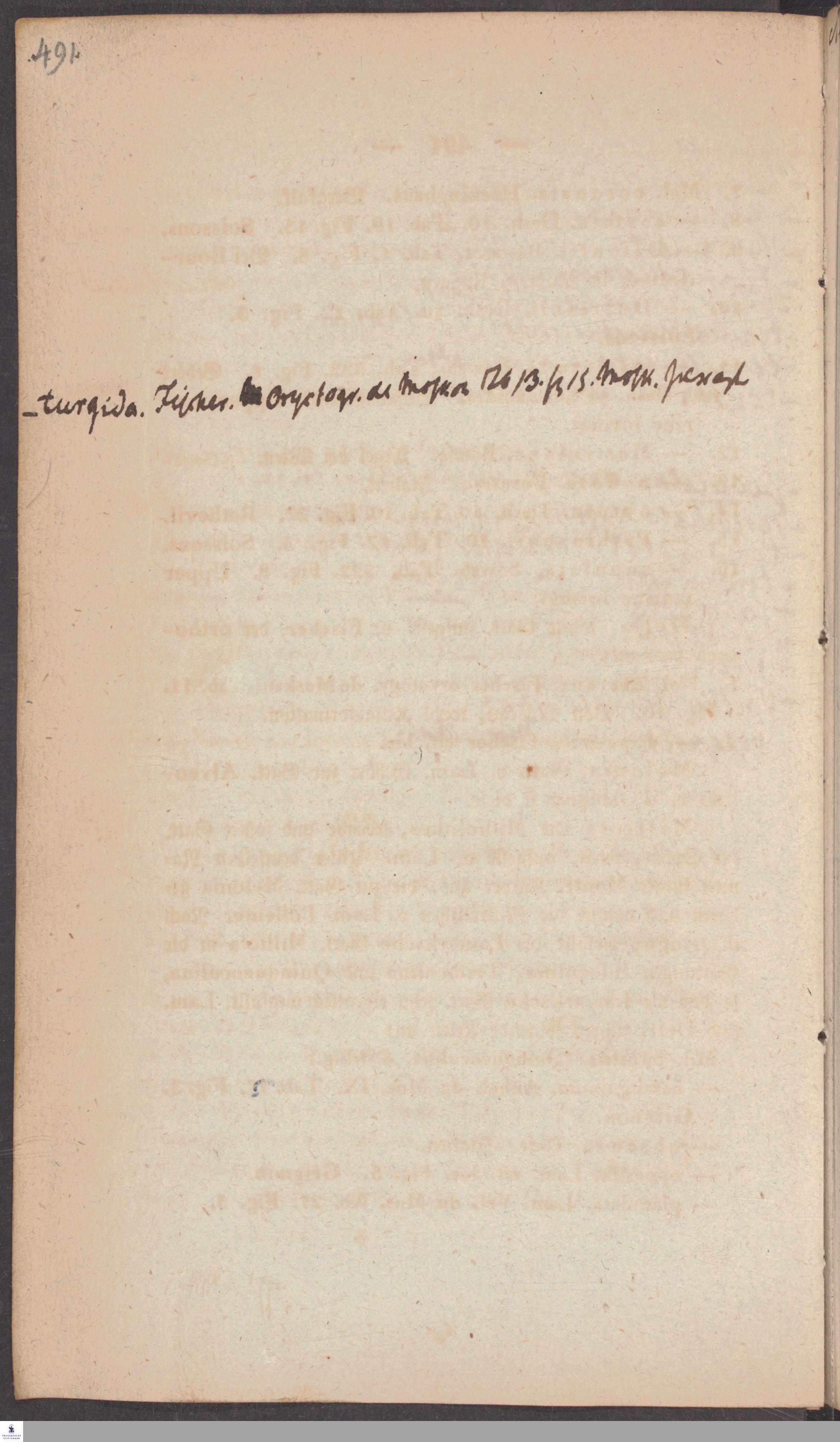 Handschriftliche Anmerkungen und Ergänzungen von Christian Keferstein in einem durchschossenen Exemplar seines Werks "Naturgeschichte des Erdkörpers. Band 2. Zweite Abtheilung. Achter Abschnitt. Die foßilen Mollusken".