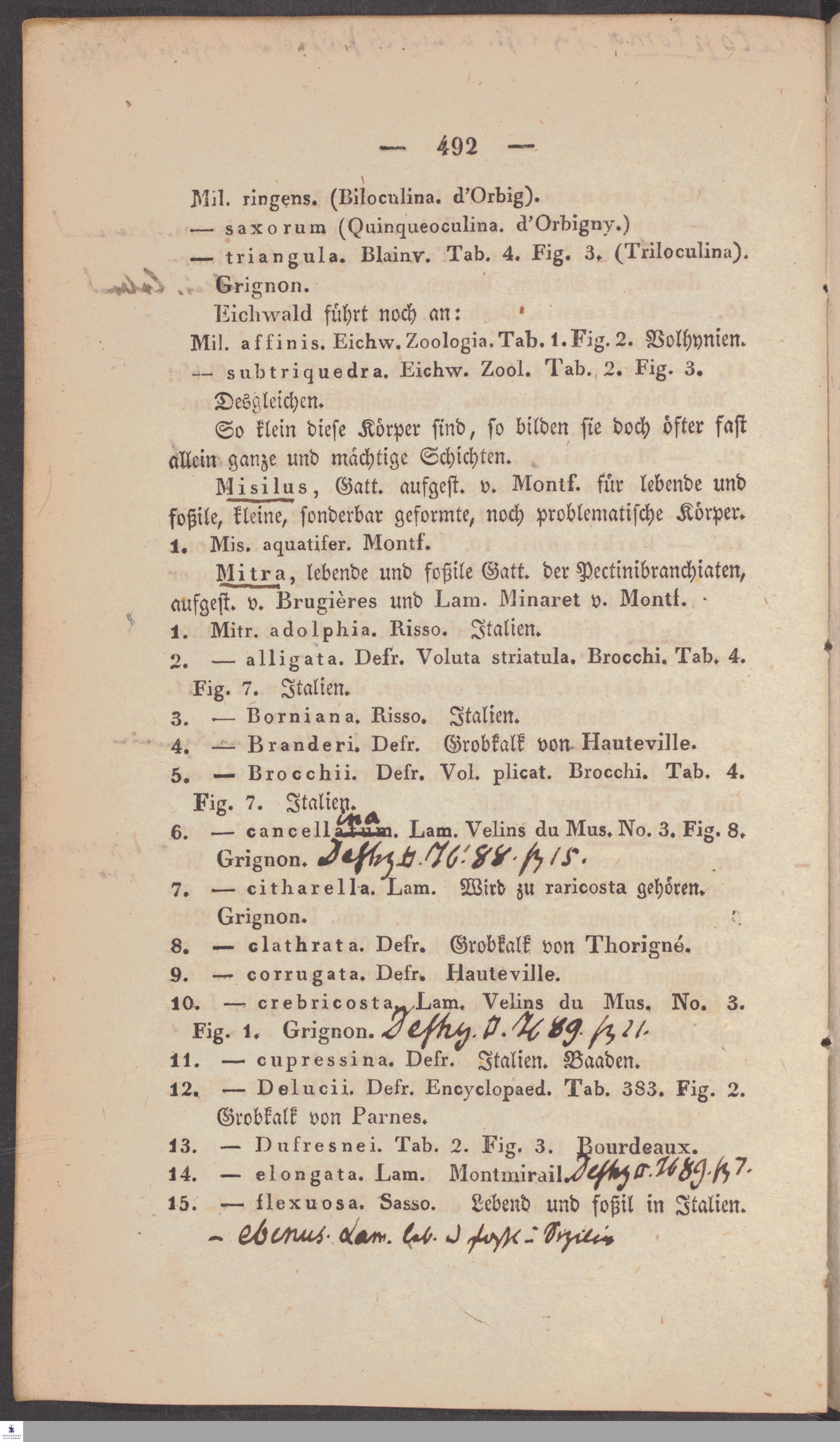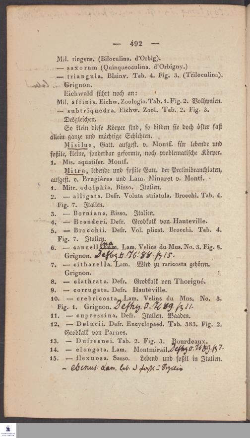 Handschriftliche Anmerkungen und Ergänzungen von Christian Keferstein in einem durchschossenen Exemplar seines Werks "Naturgeschichte des Erdkörpers. Band 2. Zweite Abtheilung. Achter Abschnitt. Die foßilen Mollusken".