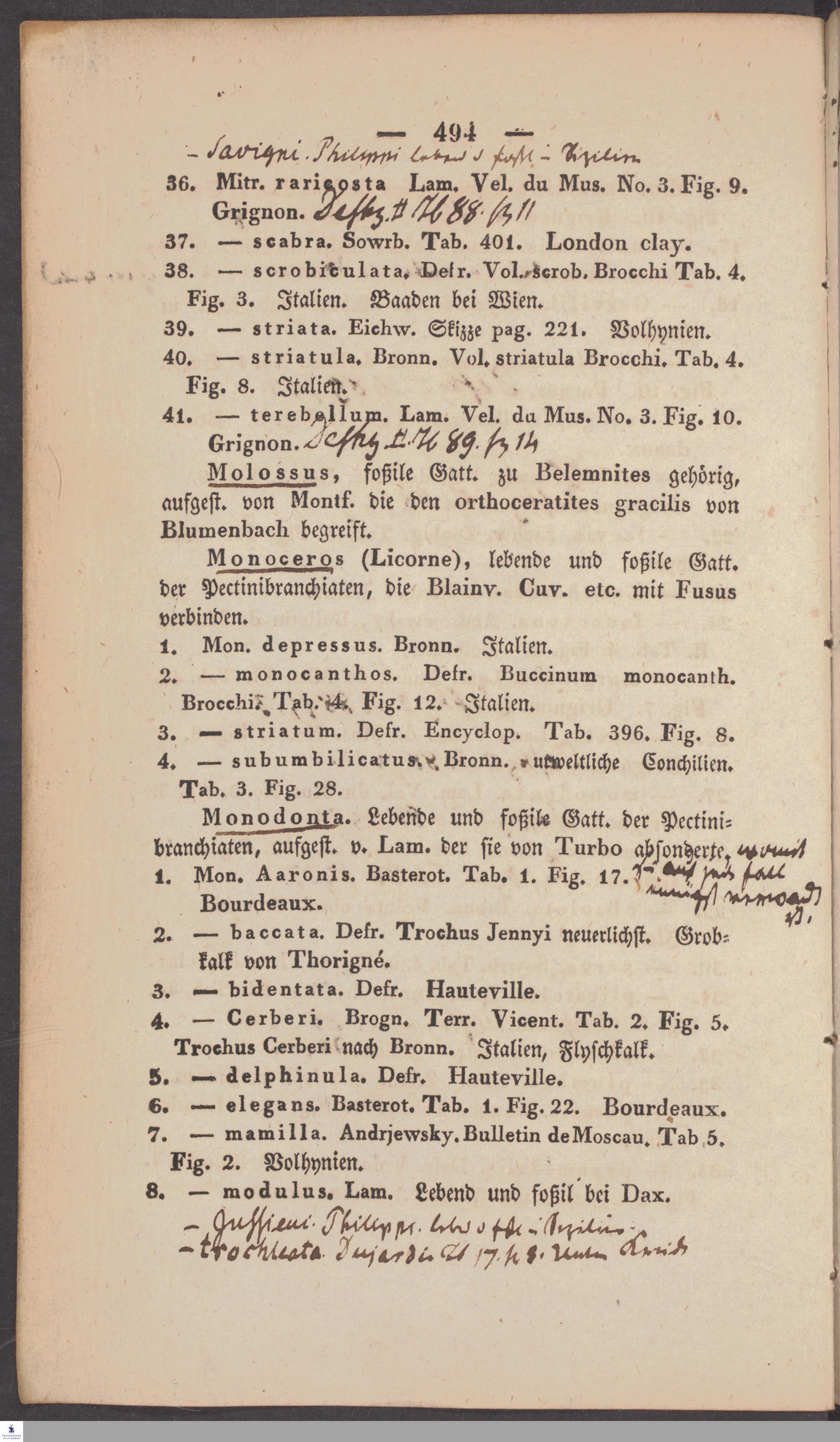 Handschriftliche Anmerkungen und Ergänzungen von Christian Keferstein in einem durchschossenen Exemplar seines Werks "Naturgeschichte des Erdkörpers. Band 2. Zweite Abtheilung. Achter Abschnitt. Die foßilen Mollusken".