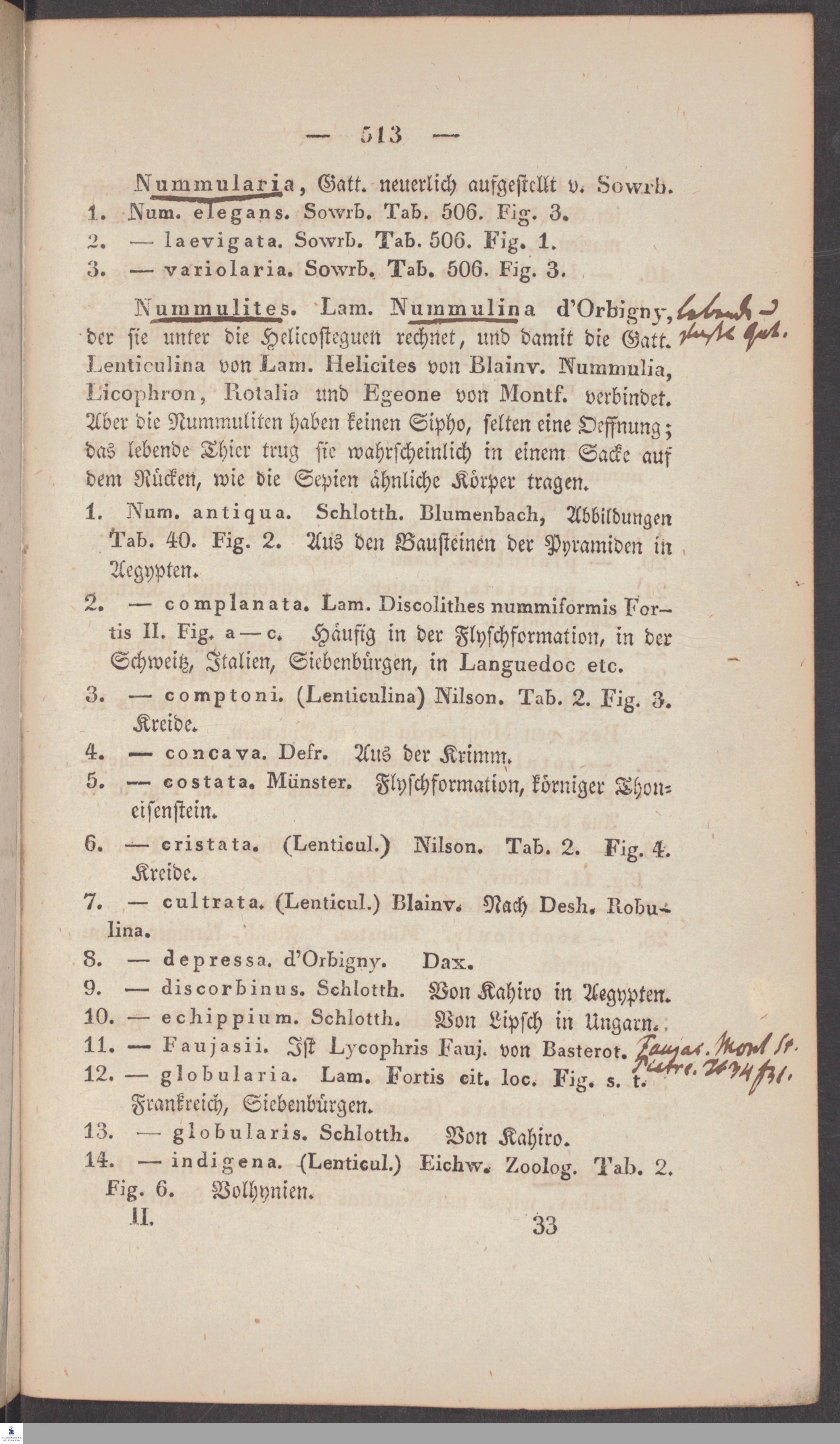 Handschriftliche Anmerkungen und Ergänzungen von Christian Keferstein in einem durchschossenen Exemplar seines Werks "Naturgeschichte des Erdkörpers. Band 2. Zweite Abtheilung. Achter Abschnitt. Die foßilen Mollusken".