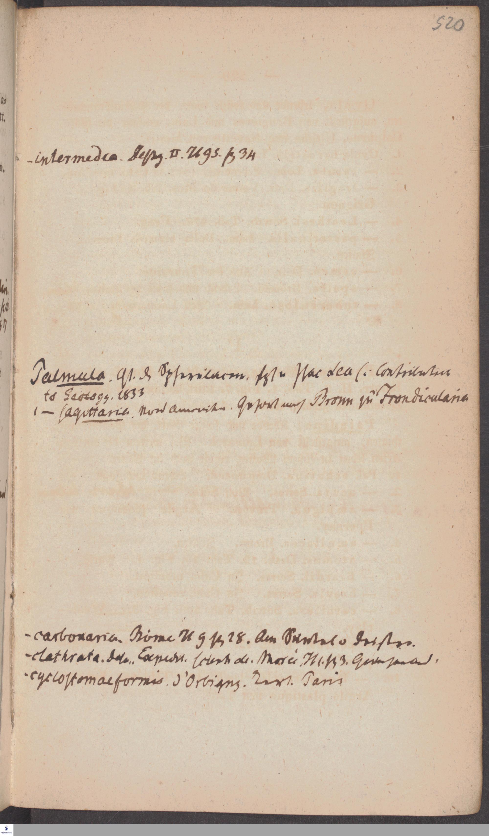 Handschriftliche Anmerkungen und Ergänzungen von Christian Keferstein in einem durchschossenen Exemplar seines Werks "Naturgeschichte des Erdkörpers. Band 2. Zweite Abtheilung. Achter Abschnitt. Die foßilen Mollusken".