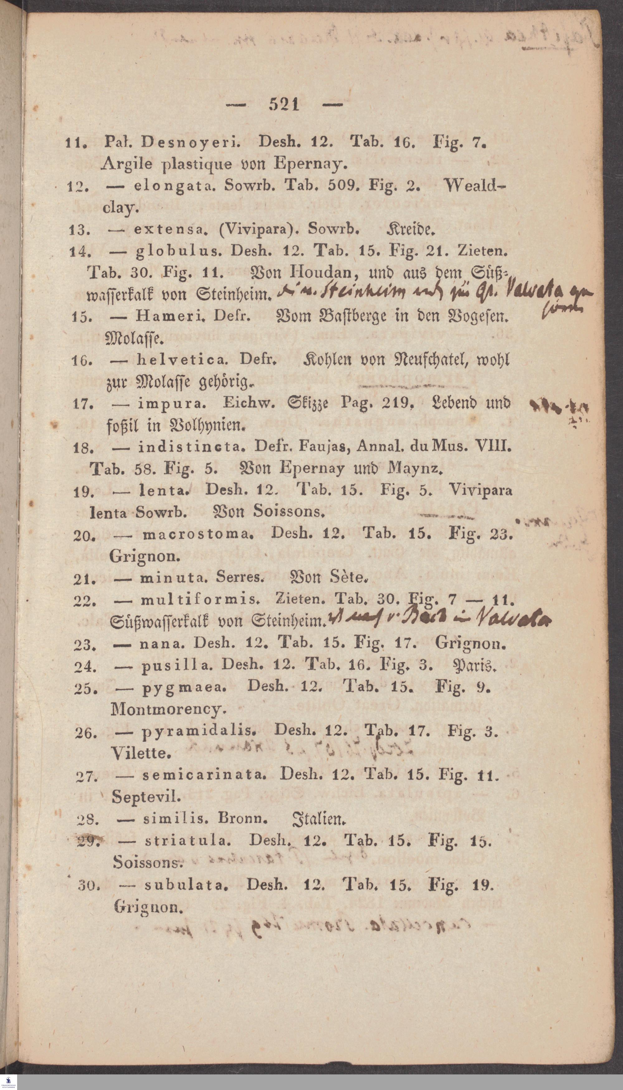 Handschriftliche Anmerkungen und Ergänzungen von Christian Keferstein in einem durchschossenen Exemplar seines Werks "Naturgeschichte des Erdkörpers. Band 2. Zweite Abtheilung. Achter Abschnitt. Die foßilen Mollusken".