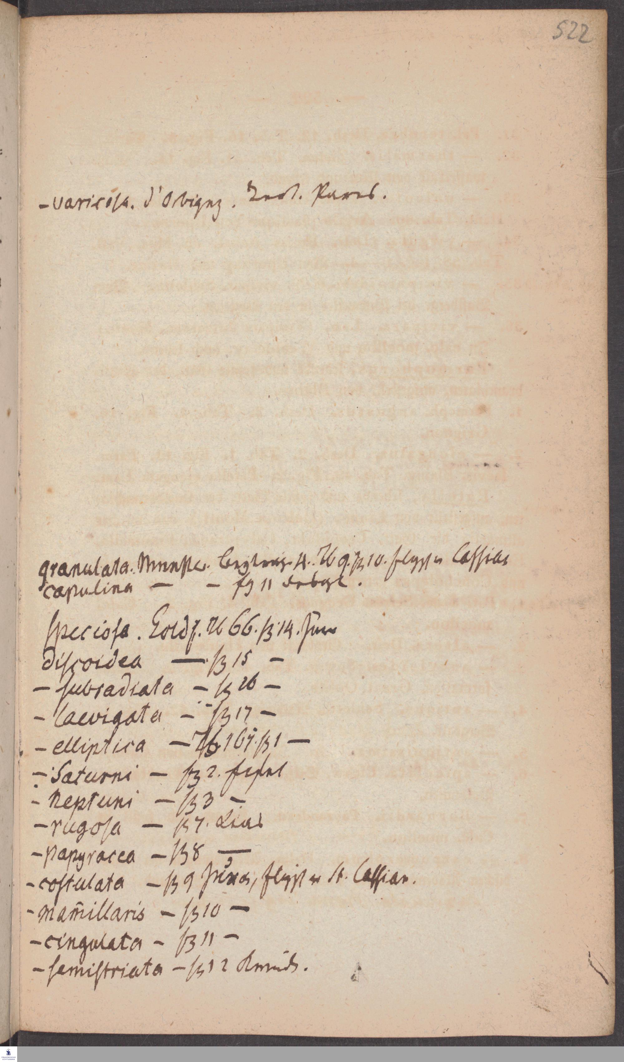 Handschriftliche Anmerkungen und Ergänzungen von Christian Keferstein in einem durchschossenen Exemplar seines Werks "Naturgeschichte des Erdkörpers. Band 2. Zweite Abtheilung. Achter Abschnitt. Die foßilen Mollusken".