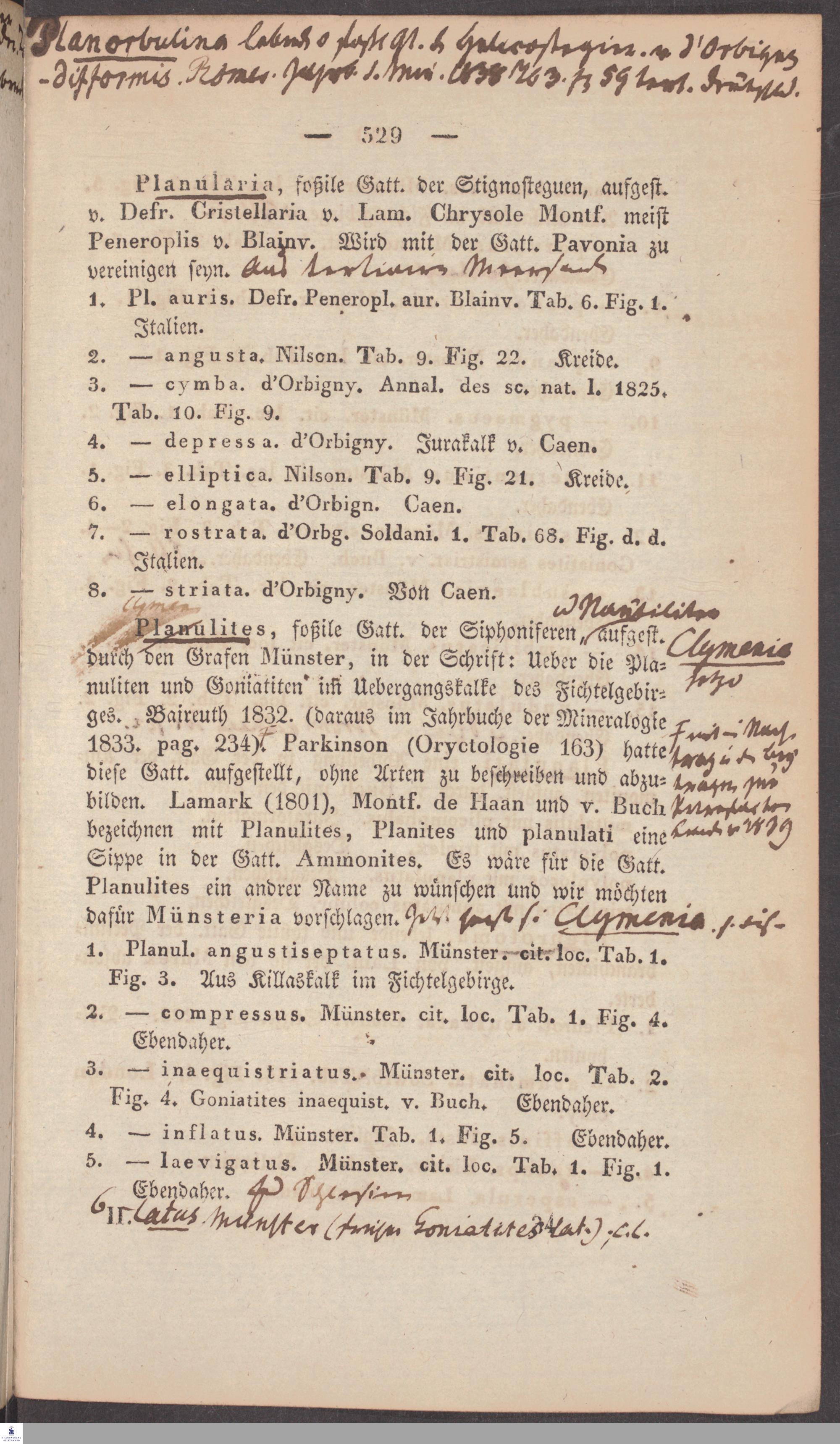 Handschriftliche Anmerkungen und Ergänzungen von Christian Keferstein in einem durchschossenen Exemplar seines Werks "Naturgeschichte des Erdkörpers. Band 2. Zweite Abtheilung. Achter Abschnitt. Die foßilen Mollusken".