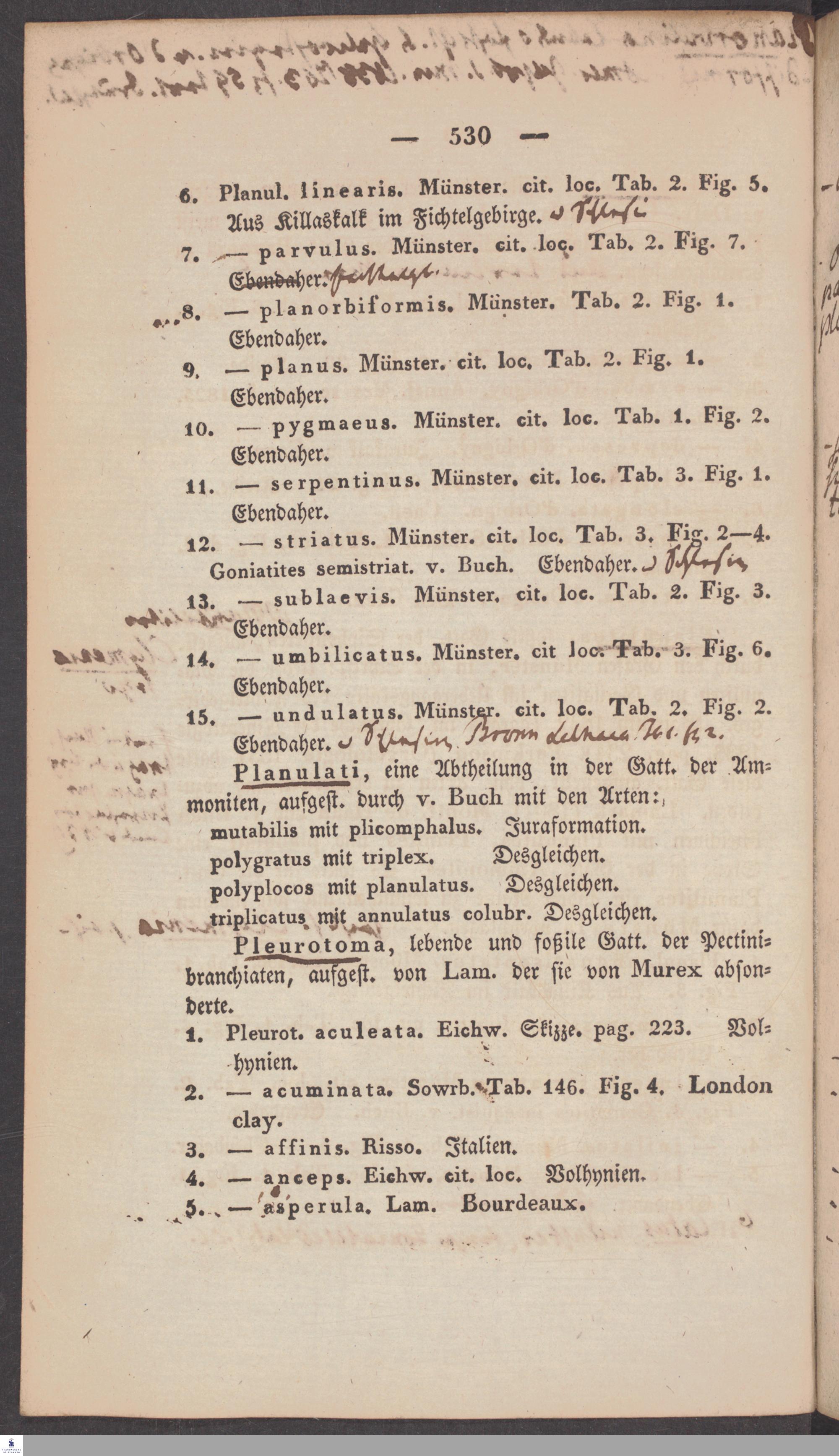 Handschriftliche Anmerkungen und Ergänzungen von Christian Keferstein in einem durchschossenen Exemplar seines Werks "Naturgeschichte des Erdkörpers. Band 2. Zweite Abtheilung. Achter Abschnitt. Die foßilen Mollusken".