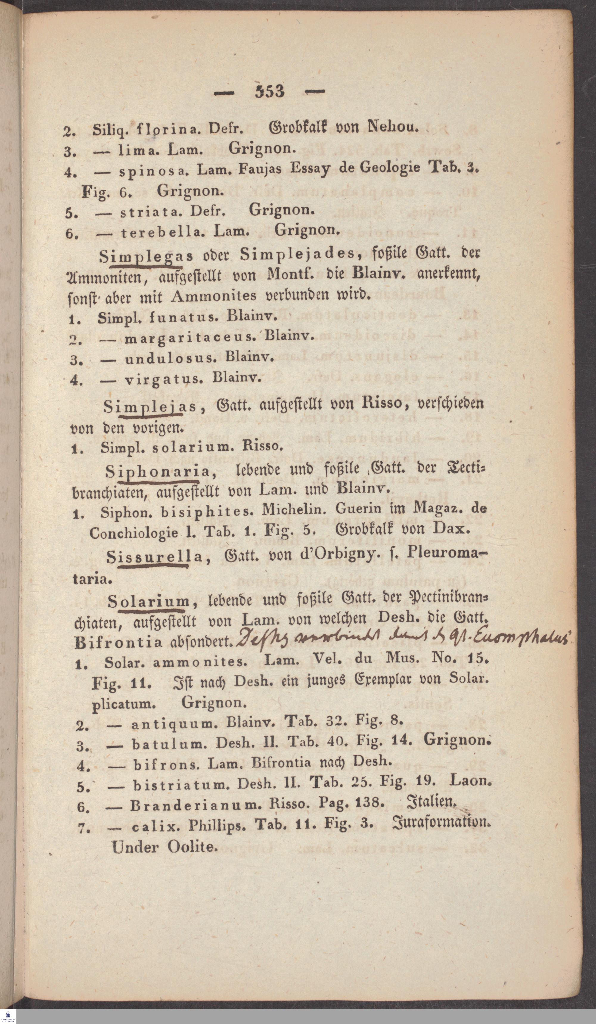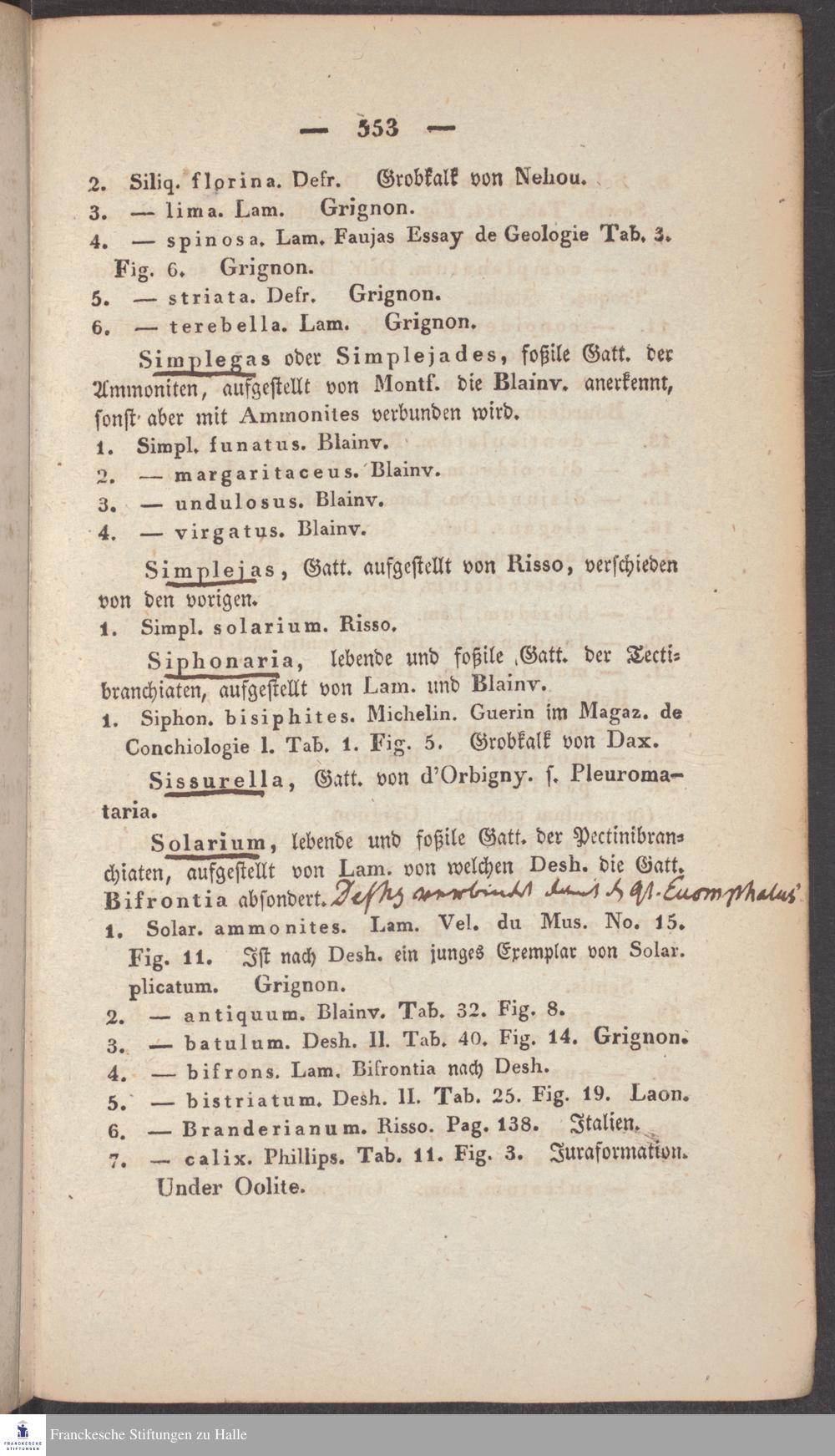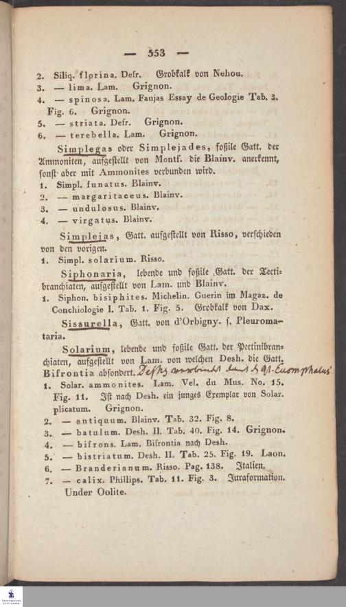 Handschriftliche Anmerkungen und Ergänzungen von Christian Keferstein in einem durchschossenen Exemplar seines Werks "Naturgeschichte des Erdkörpers. Band 2. Zweite Abtheilung. Achter Abschnitt. Die foßilen Mollusken".