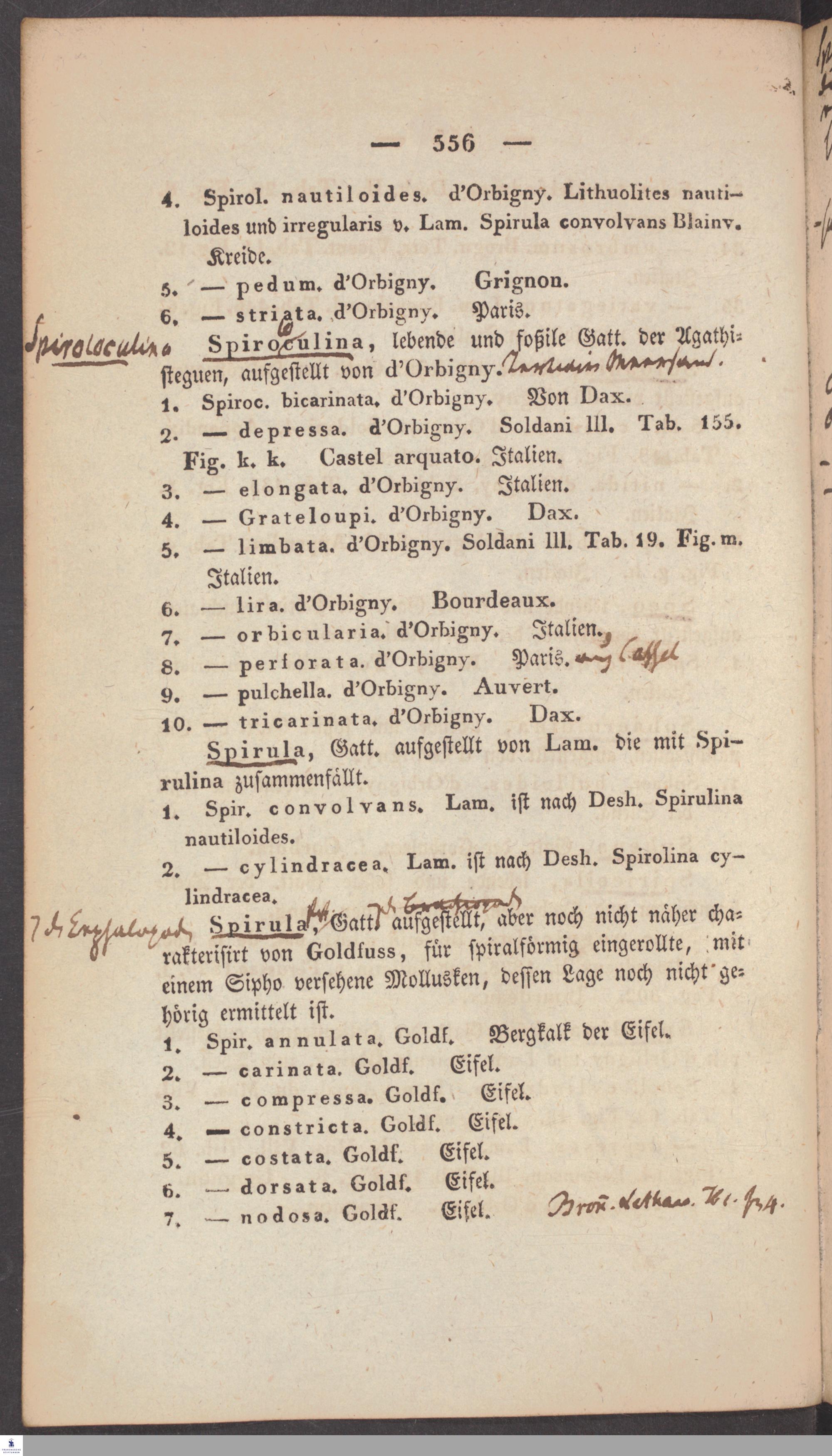 Handschriftliche Anmerkungen und Ergänzungen von Christian Keferstein in einem durchschossenen Exemplar seines Werks "Naturgeschichte des Erdkörpers. Band 2. Zweite Abtheilung. Achter Abschnitt. Die foßilen Mollusken".