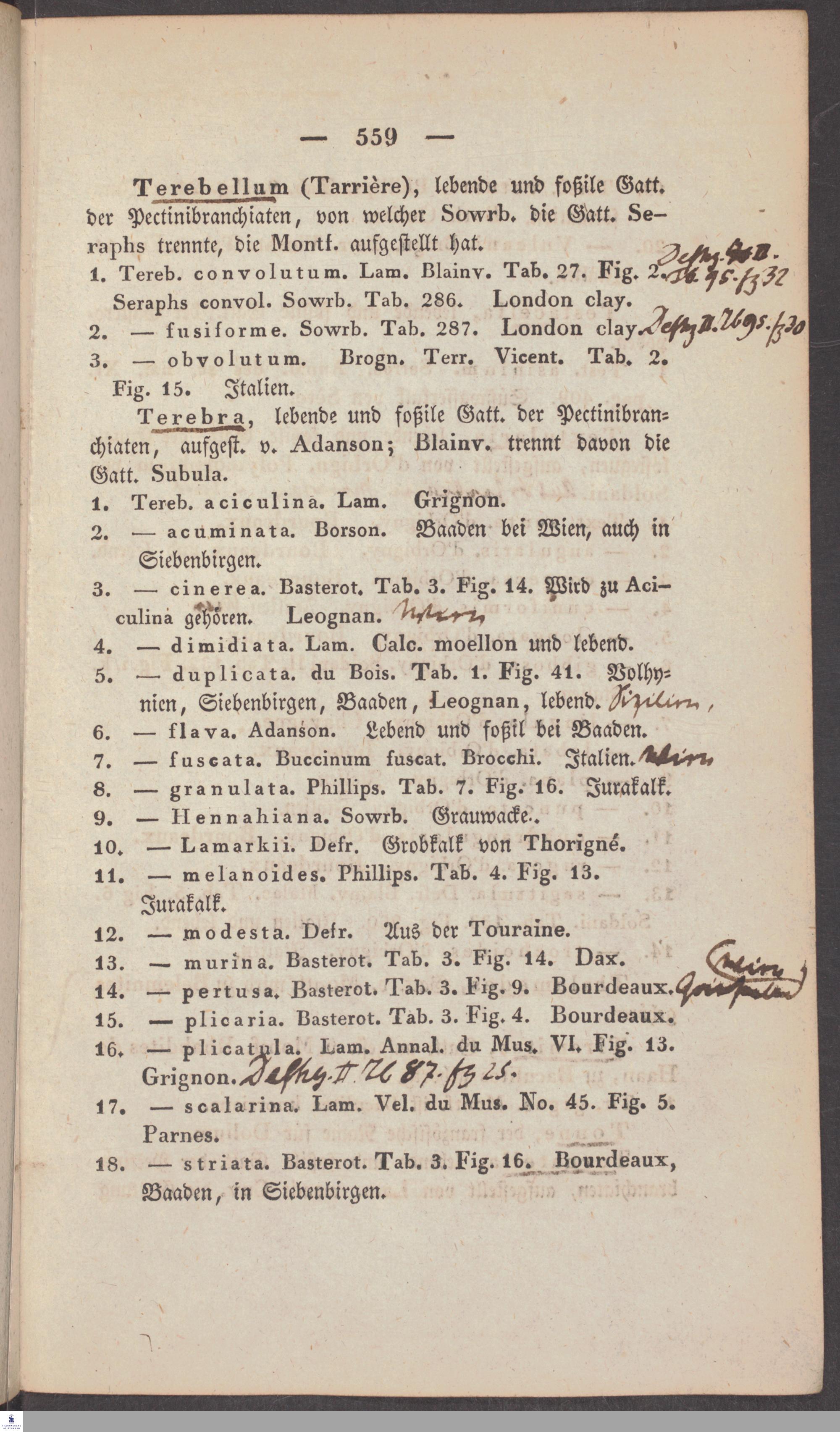 Handschriftliche Anmerkungen und Ergänzungen von Christian Keferstein in einem durchschossenen Exemplar seines Werks "Naturgeschichte des Erdkörpers. Band 2. Zweite Abtheilung. Achter Abschnitt. Die foßilen Mollusken".
