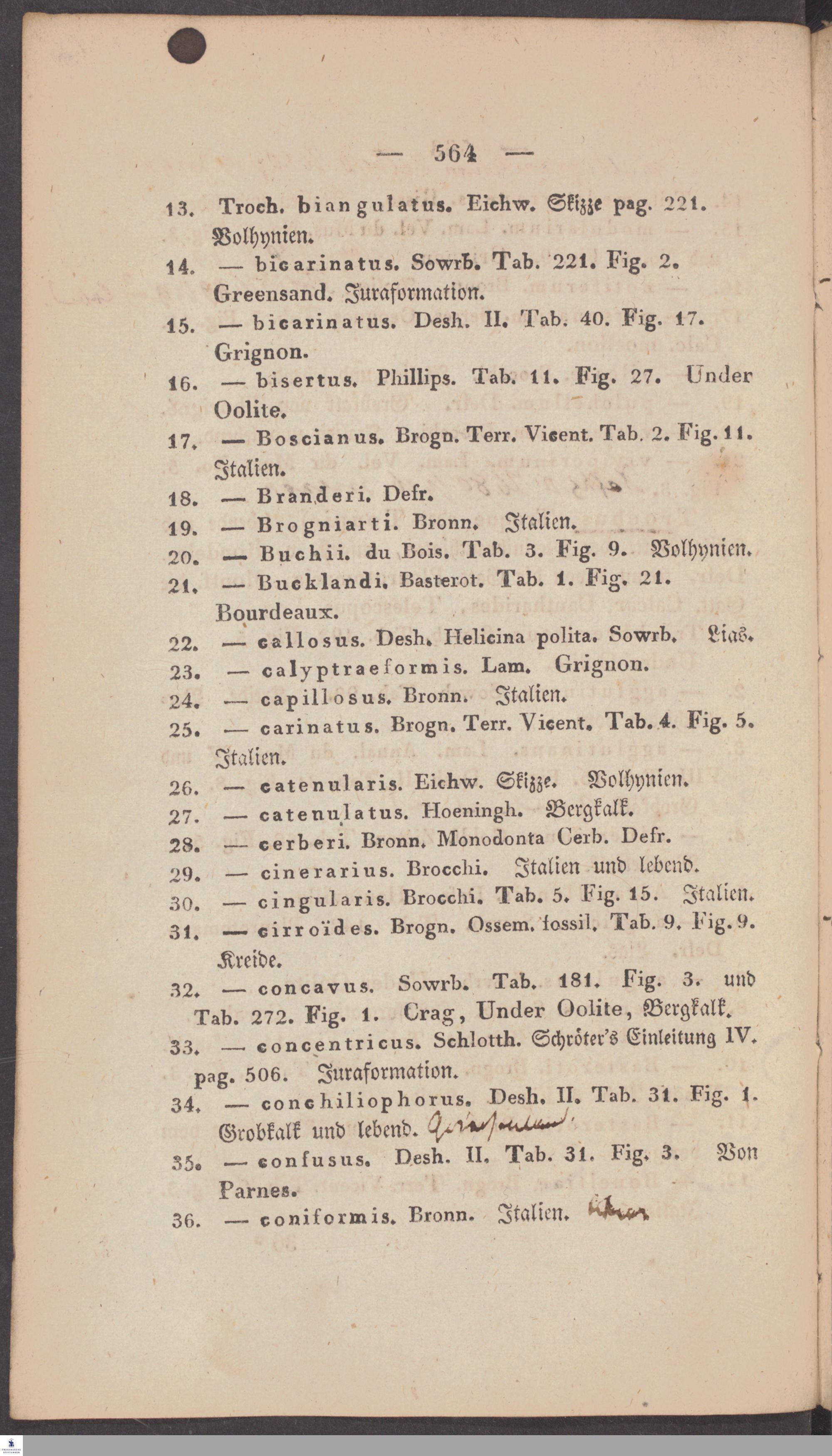 Handschriftliche Anmerkungen und Ergänzungen von Christian Keferstein in einem durchschossenen Exemplar seines Werks "Naturgeschichte des Erdkörpers. Band 2. Zweite Abtheilung. Achter Abschnitt. Die foßilen Mollusken".