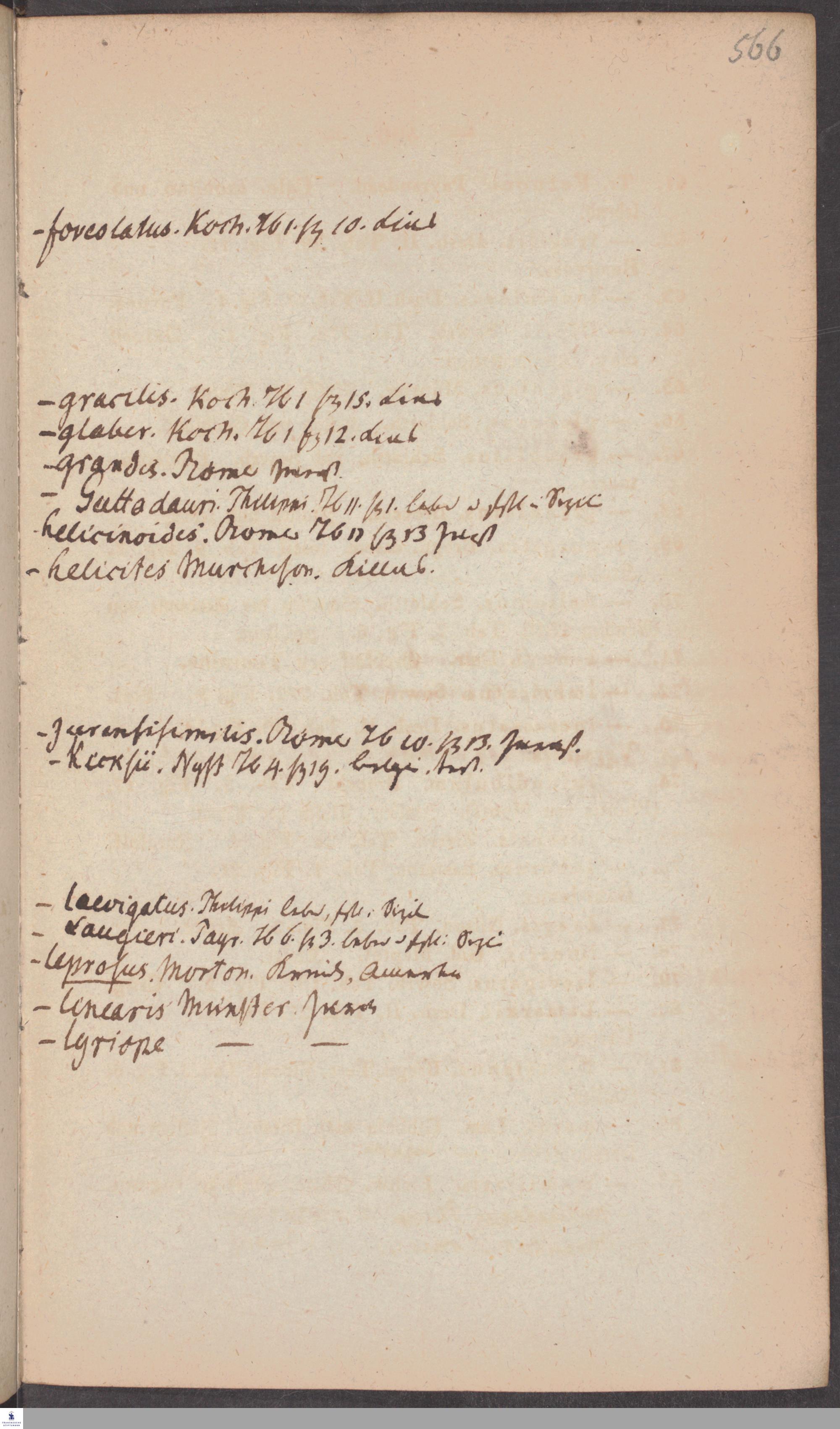 Handschriftliche Anmerkungen und Ergänzungen von Christian Keferstein in einem durchschossenen Exemplar seines Werks "Naturgeschichte des Erdkörpers. Band 2. Zweite Abtheilung. Achter Abschnitt. Die foßilen Mollusken".