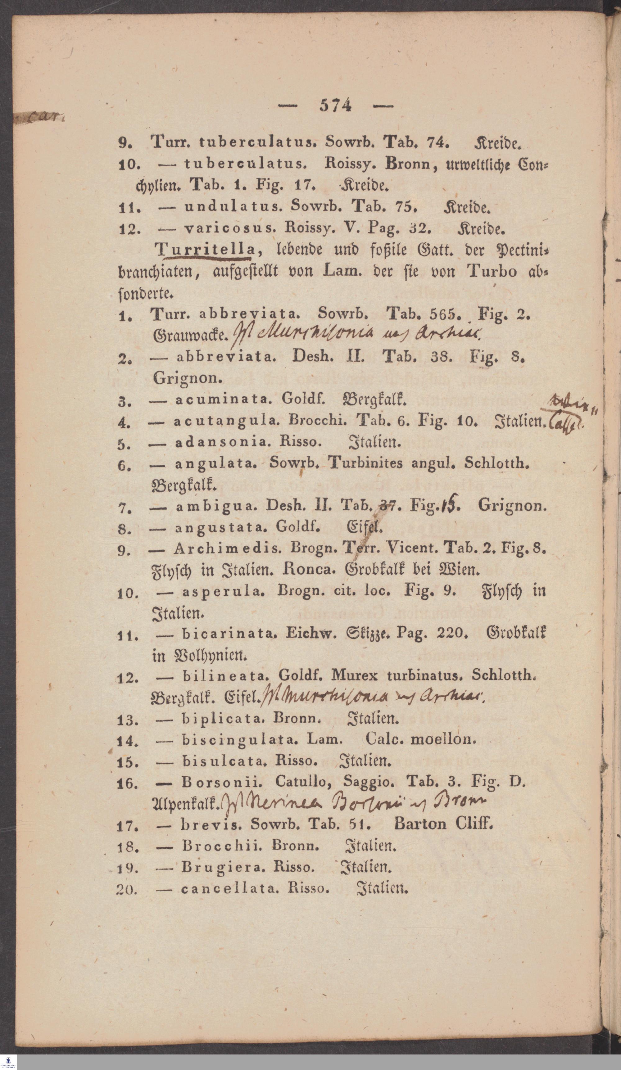 Handschriftliche Anmerkungen und Ergänzungen von Christian Keferstein in einem durchschossenen Exemplar seines Werks "Naturgeschichte des Erdkörpers. Band 2. Zweite Abtheilung. Achter Abschnitt. Die foßilen Mollusken".