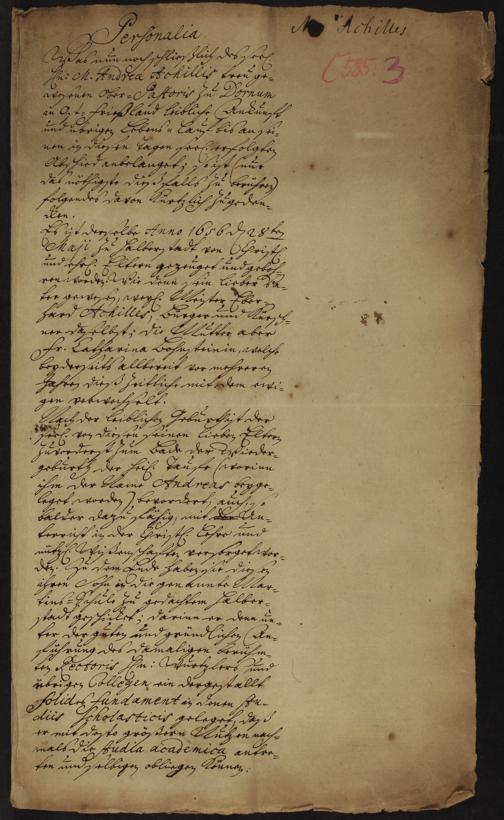 Biografie von Andreas Achilles von seiner Geburt 1651 in Halberstadt bis zu seinem Tod 1721 in Halle. Enthält auch: Mitteilungen über die Eltern Catharina und Eberhard Achilles; Taufe; Besuch der Martinsschule in Halberstadt, Unterricht bei Johann Christoph Wurtzler; Studium an der Universität Leipzig, Magisterabschluss und Habilitation; Erforschung der Heiligen Schrift und Kampf gegen den Mißbrauch der Philosophie; Berufung zum Pastor der Hospitalkirche zum Heiligen Geist in Halberstadt; Berufung zum Oberpastor in Dornum, Würdigung seiner dortigen Amtsführung; nach Entlassung in Dornum, erneut in Halberstadt bei Georg Christian Schreiber; Aufenthalt in Halle, Aufnahme ins Waisenhaus, hier Druck seiner noch in Dornum gehaltenen Predigt "Betrachtung von der Gnade Gottes"; Würdigung der Gelehrsamkeit von A. Achilles; Auszug aus einem Kondolenzschreiben von Hieronymus Brückner aus Wittmund zum Tod von A. Achilles; Letzte Stunden, Lungenerkrankung, behandelt von Johann Juncker, Krankheitsverlauf, Lesung aus der Bibel, Tod, Dank an Gott für die A. Achilles erwiesenen Wohltaten; Fürbitte des Verfassers.