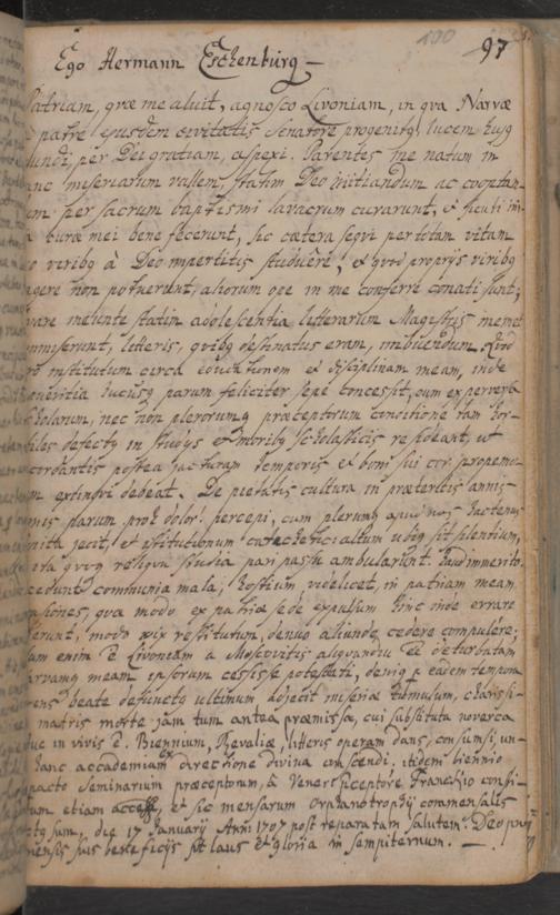 Kurzer Lebenslauf von Hermann Eschenburg; verfasst in Ich-Form; Herkunftsort Narva; ab 17.01.1707 Gewährung des Benefiziums.
