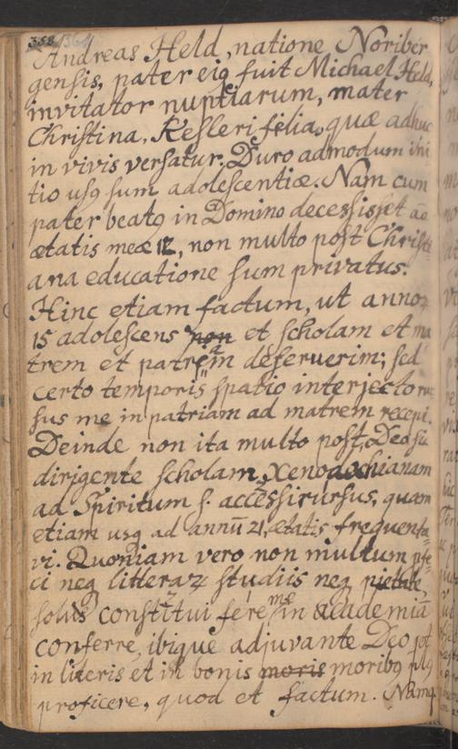 Kurzer Lebenslauf von Andreas Held; verfasst in Ich-Form; Herkunftsort Nürnberg; Eltern Michael Held und Christina, geb. Kehler; Hausunterricht und Schulbesuch in Nürnberg; ab 1706 Studium in Jena; ab 06.1709 Gewährung des Benefiziums.