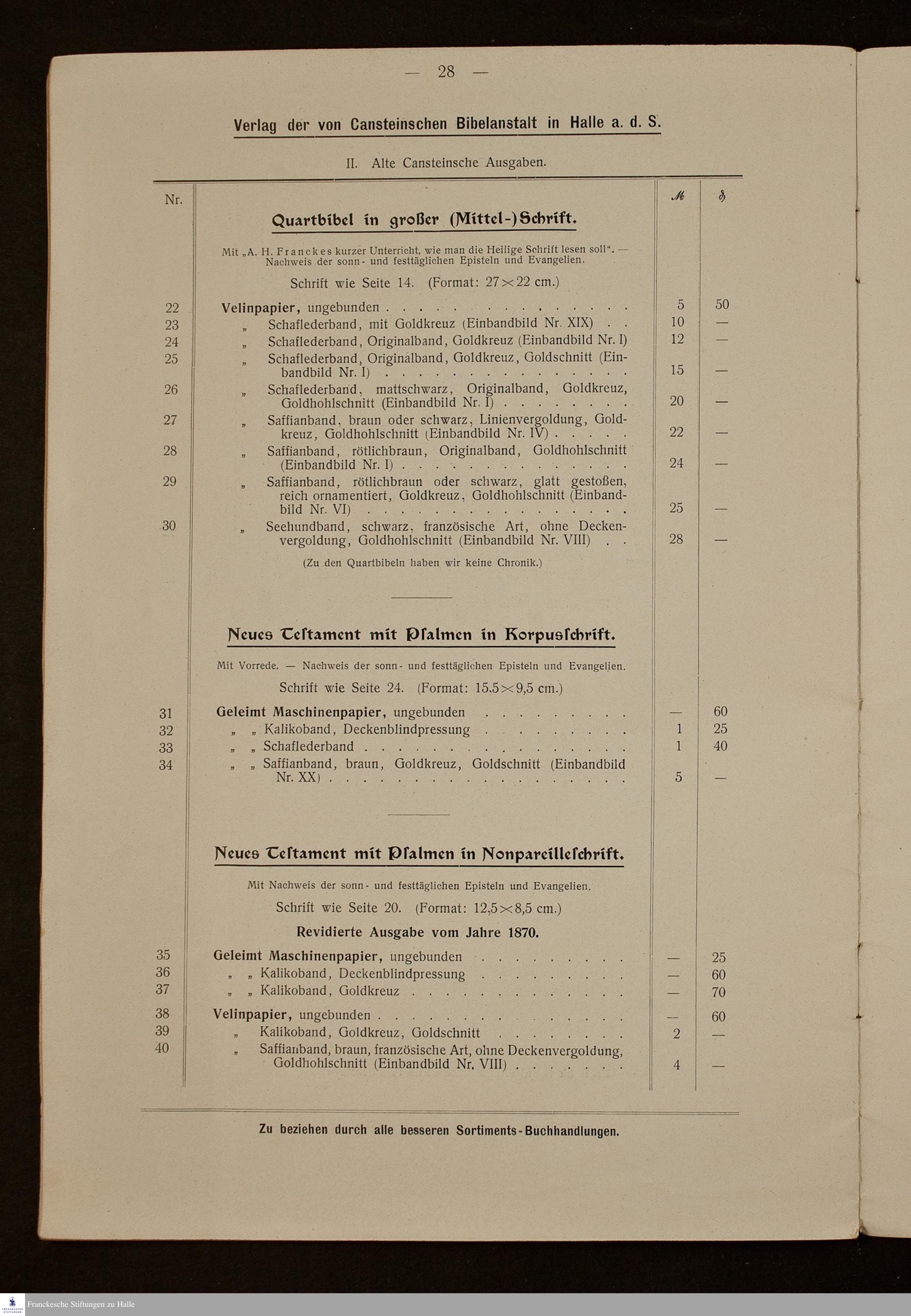 Preisverzeichnis der von Cansteinschen Bibelanstalt Halle a. d. S.