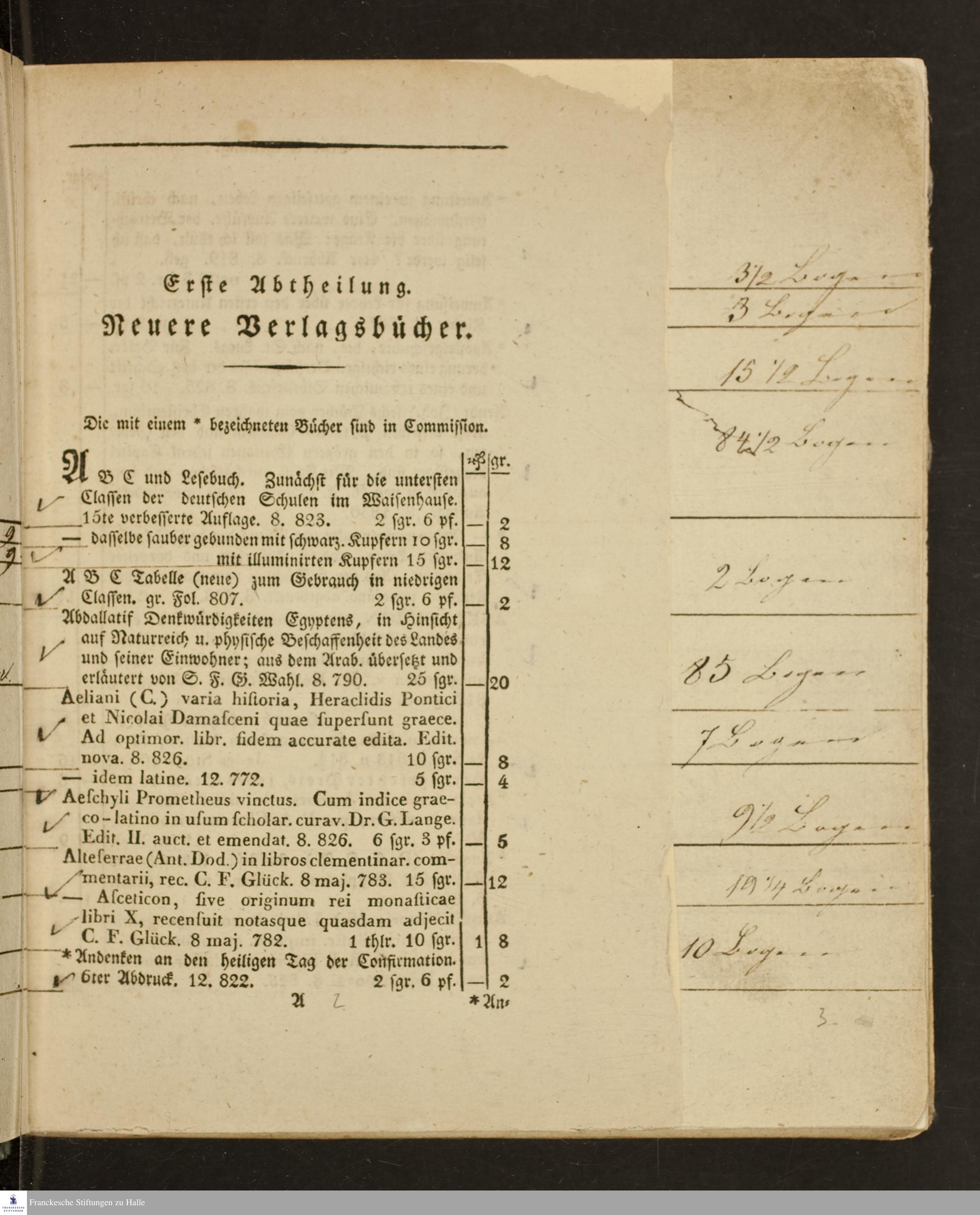 Verlagskatalog der Buchhandlung des Waisenhauses in Halle : in zwei Abtheilungen, I. Neuere Verlagsbücher. pag. 1-56. II. Aeltere Verlagsbücher. pag. 57-104 ; nebst einem Anhange enthaltend ein Verzeichnis der sämmtlichen in diesem Verlage erschienenen classischen Autoren und andern Schulbücher ; bis Jubilate-Messe 1830 fortgesetzt