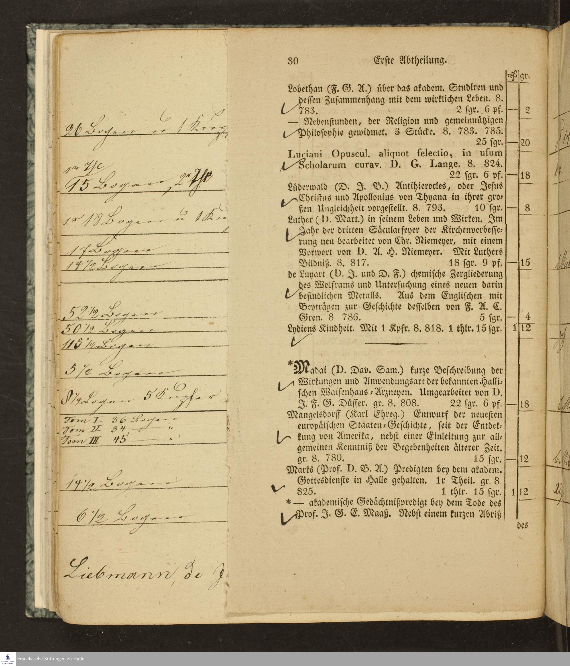 Verlagskatalog der Buchhandlung des Waisenhauses in Halle : in zwei Abtheilungen, I. Neuere Verlagsbücher. pag. 1-56. II. Aeltere Verlagsbücher. pag. 57-104 ; nebst einem Anhange enthaltend ein Verzeichnis der sämmtlichen in diesem Verlage erschienenen classischen Autoren und andern Schulbücher ; bis Jubilate-Messe 1830 fortgesetzt