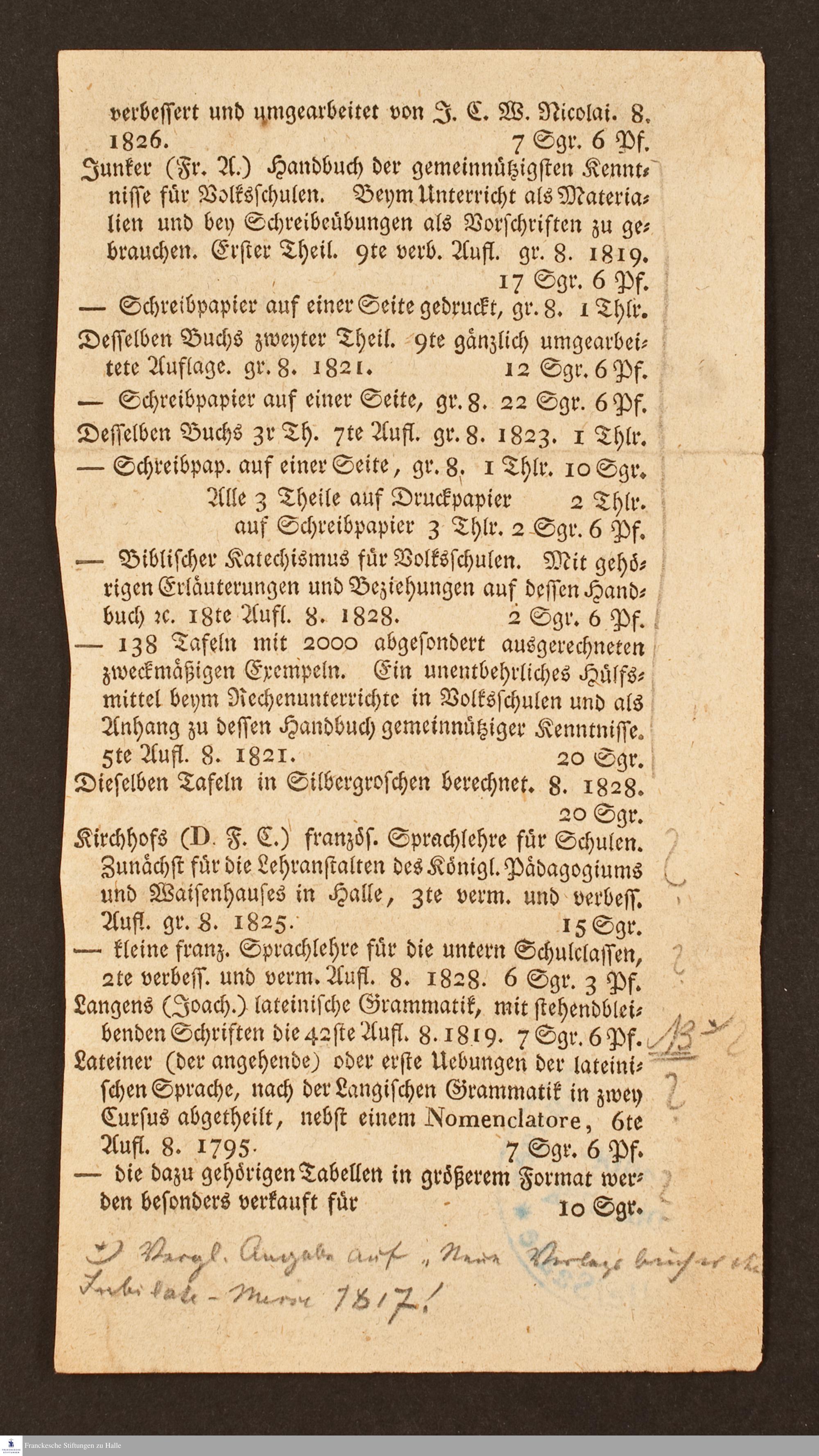 In unserem Verlage sind von dem Verfasser dieses Buches noch folgende Schriften um beigesetzte Preise zu haben ... : [Verlagsanzeige der Buchhandlung des Waisenhauses Halle]