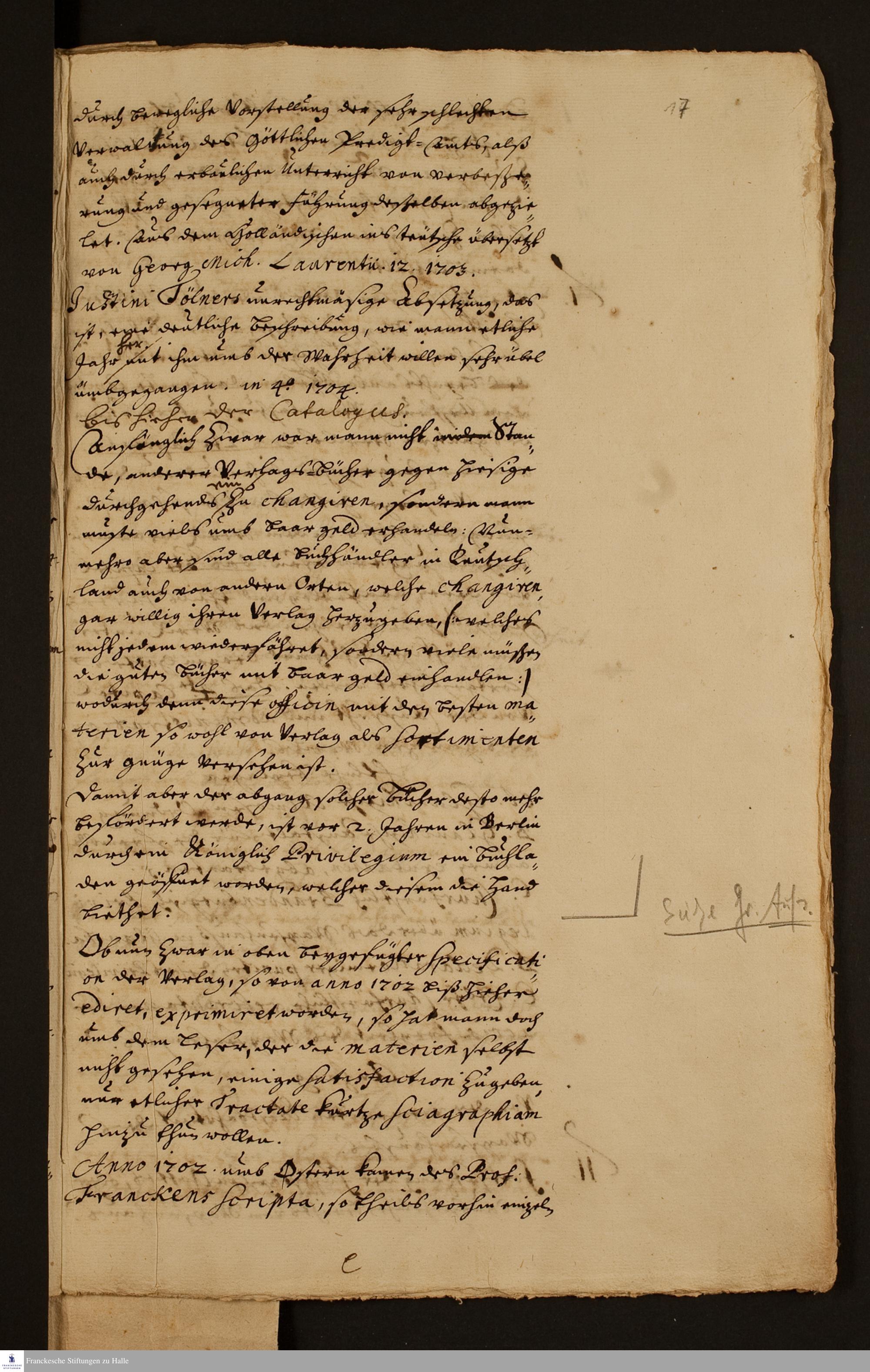 Continuatio wie die gnädige Hand Gottes die beyden Anstalten der Buchdruckerey und des Buchladens biß 1705 im Januario im Seegen fortgeführet hat : [Handschrift]